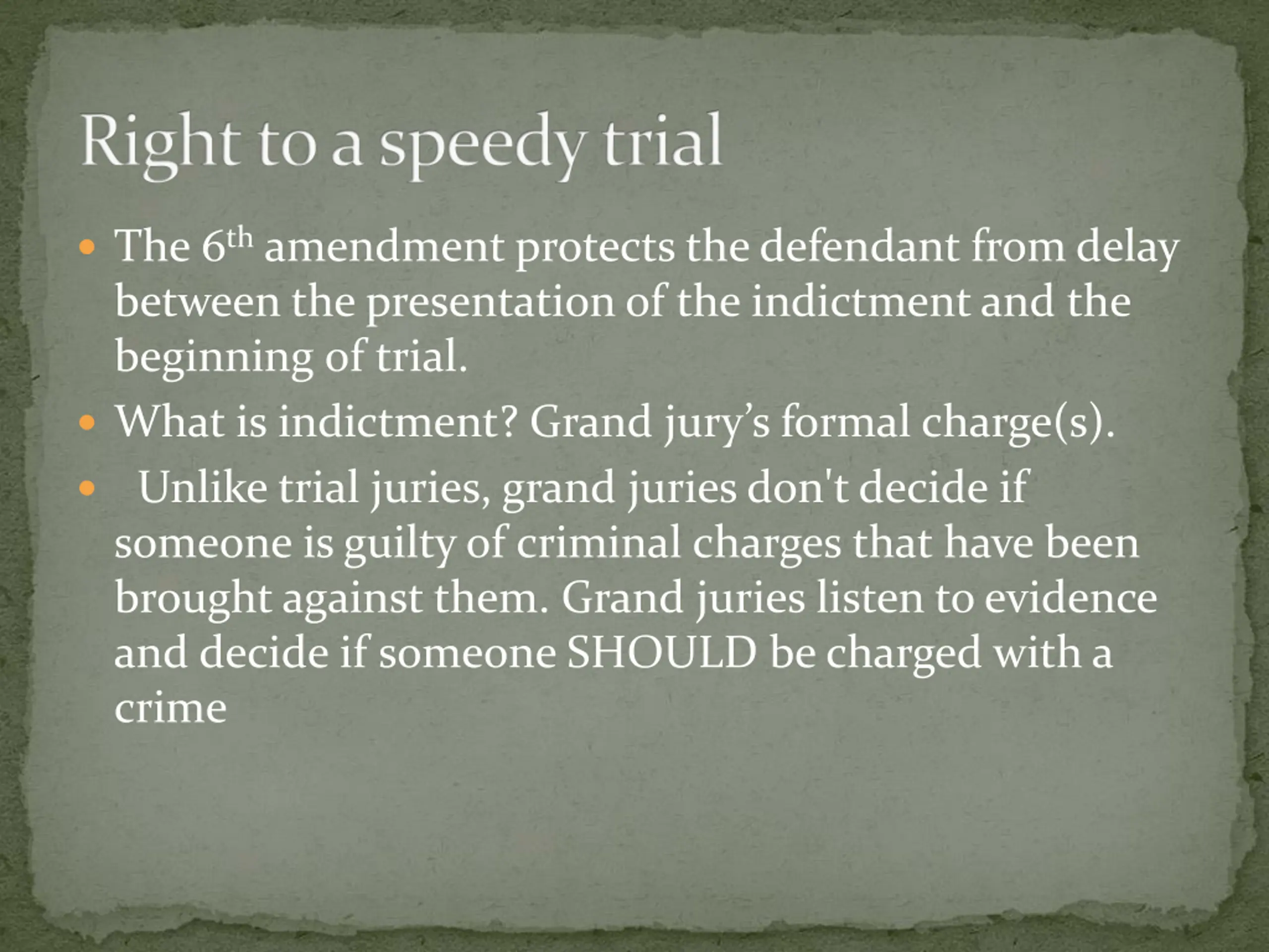 Right to a speedy trial The 6thamendment protects the defendant from delay between the presentation of the indictment and the beginning of trial. What is indictment? Grand jury s formal charge(s). Unlike trial juries, grand juries don't decide if someone is guilty of criminal charges that have been brought against them. Grand juries listen to evidence and decide if someone SHOULD be charged with a crime