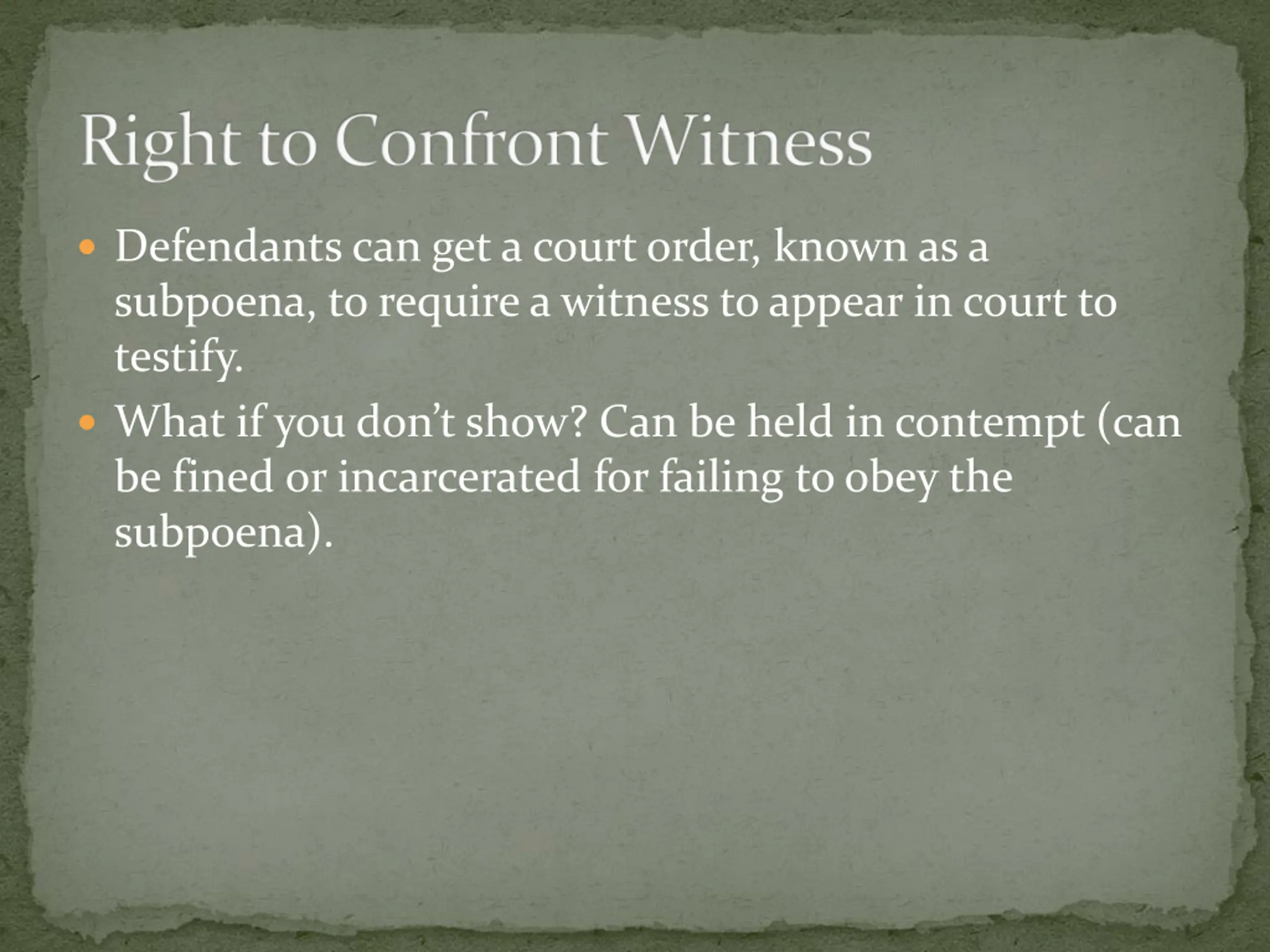 Right to Confront Witness Defendants can get a court order, known as a subpoena, to require a witness to appear in court to testify. What if you don t show? Can be held in contempt (can be fined or incarcerated for failing to obey the subpoena).