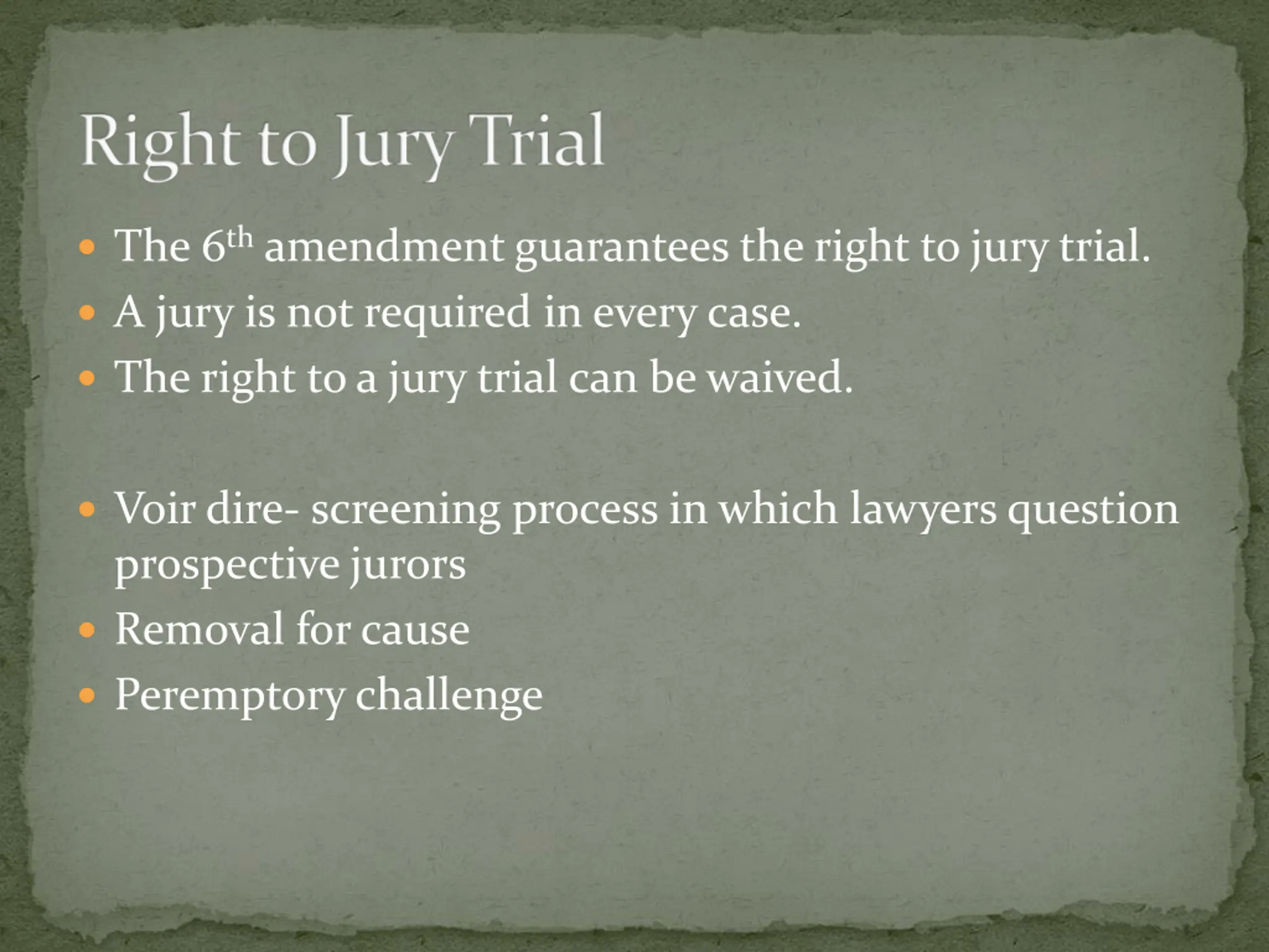 Right to Jury Trial The 6thamendment guarantees the right to jury trial. A jury is not required in every case. The right to a jury trial can be waived. Voirdire- screening process in which lawyers question prospective jurors Removal for cause Peremptory challenge