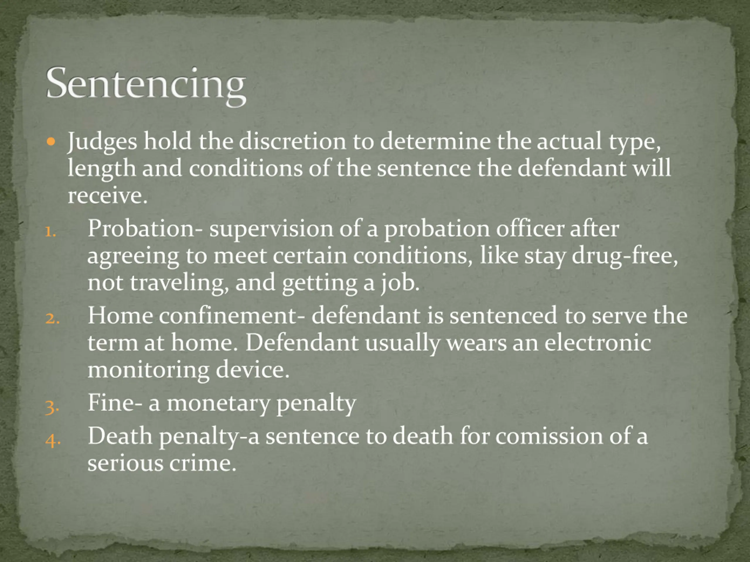 Sentencing Judges hold the discretion to determine the actual type, length and conditions of the sentence the defendant will receive. Probation- supervision of a probation officer after agreeing to meet certain conditions, like stay drug-free, not traveling, and getting a job. Home confinement- defendant is sentenced to serve the term at home. Defendant usually wears an electronic monitoring device. Fine- a monetary penalty Death penalty-a sentence to death for comission of a serious crime. 1. 2. 3. 4.
