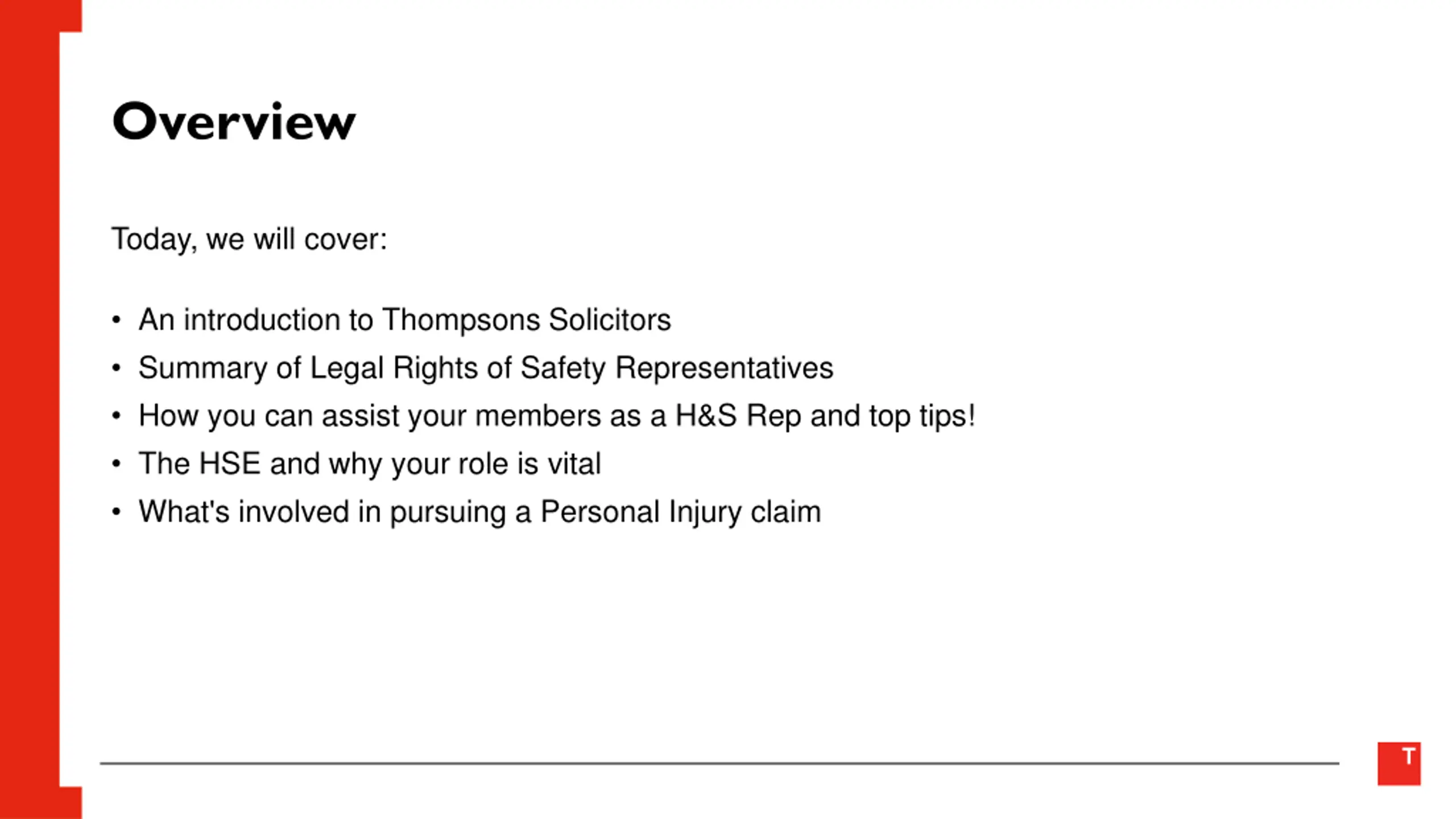 Overview Today, we will cover: An introduction to Thompsons Solicitors Summary of Legal Rights of Safety Representatives How you can assist your members as a H&S Rep and top tips! The HSE and why your role is vital What's involved in pursuing a Personal Injury claim