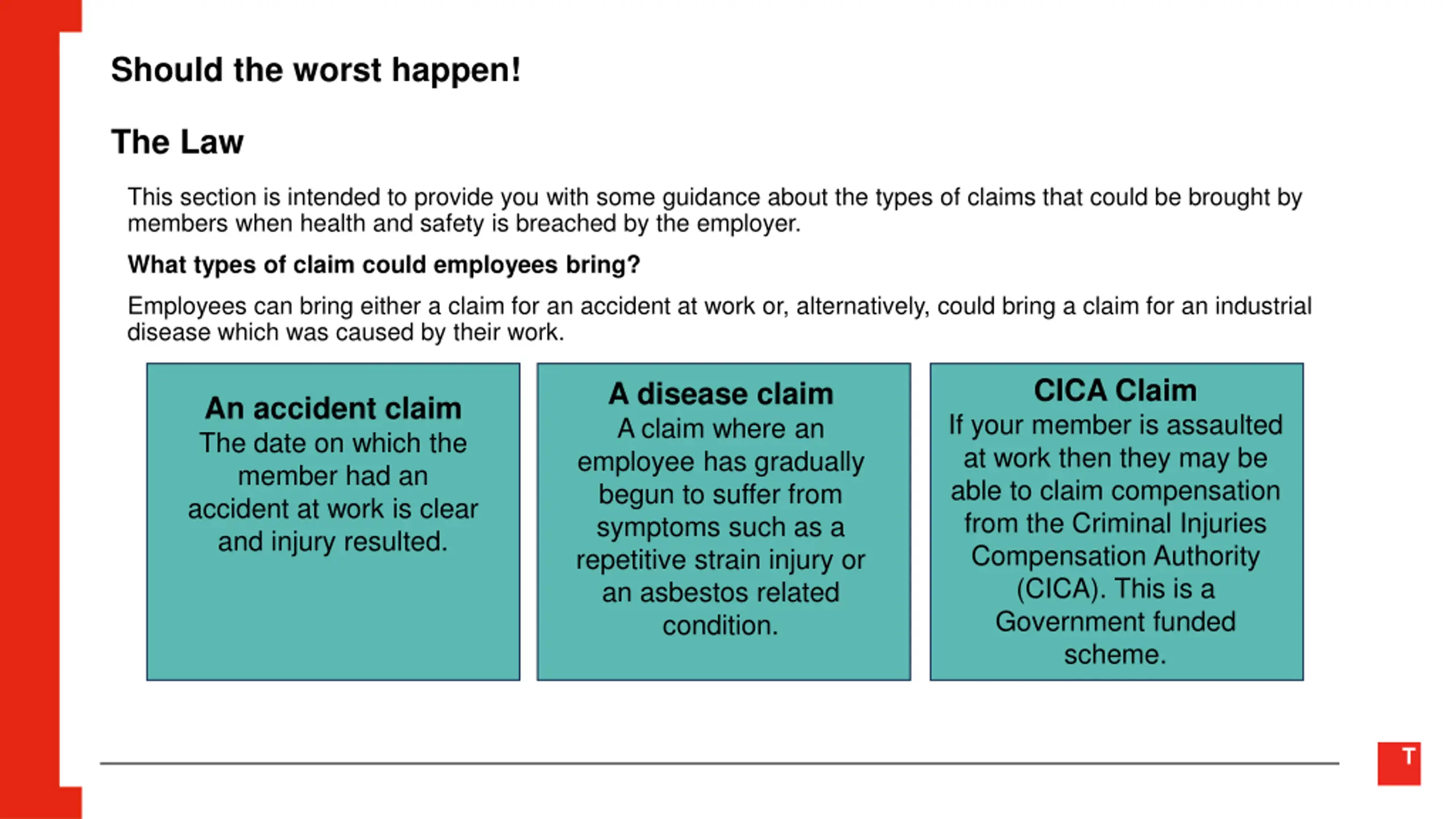 Should the worst happen! The Law This section is intended to provide you with some guidance about the types of claims that could be brought by members when health and safety is breached by the employer. What types of claim could employees bring? Employees can bring either a claim for an accident at work or, alternatively, could bring a claim for an industrial disease which was caused by their work. CICA Claim A disease claim A claim where an employee has gradually begun to suffer from symptoms such as a repetitive strain injury or an asbestos related condition. An accident claim The date on which the member had an accident at work is clear and injury resulted. If your member is assaulted at work then they may be able to claim compensation from the Criminal Injuries Compensation Authority (CICA). This is a Government funded scheme.