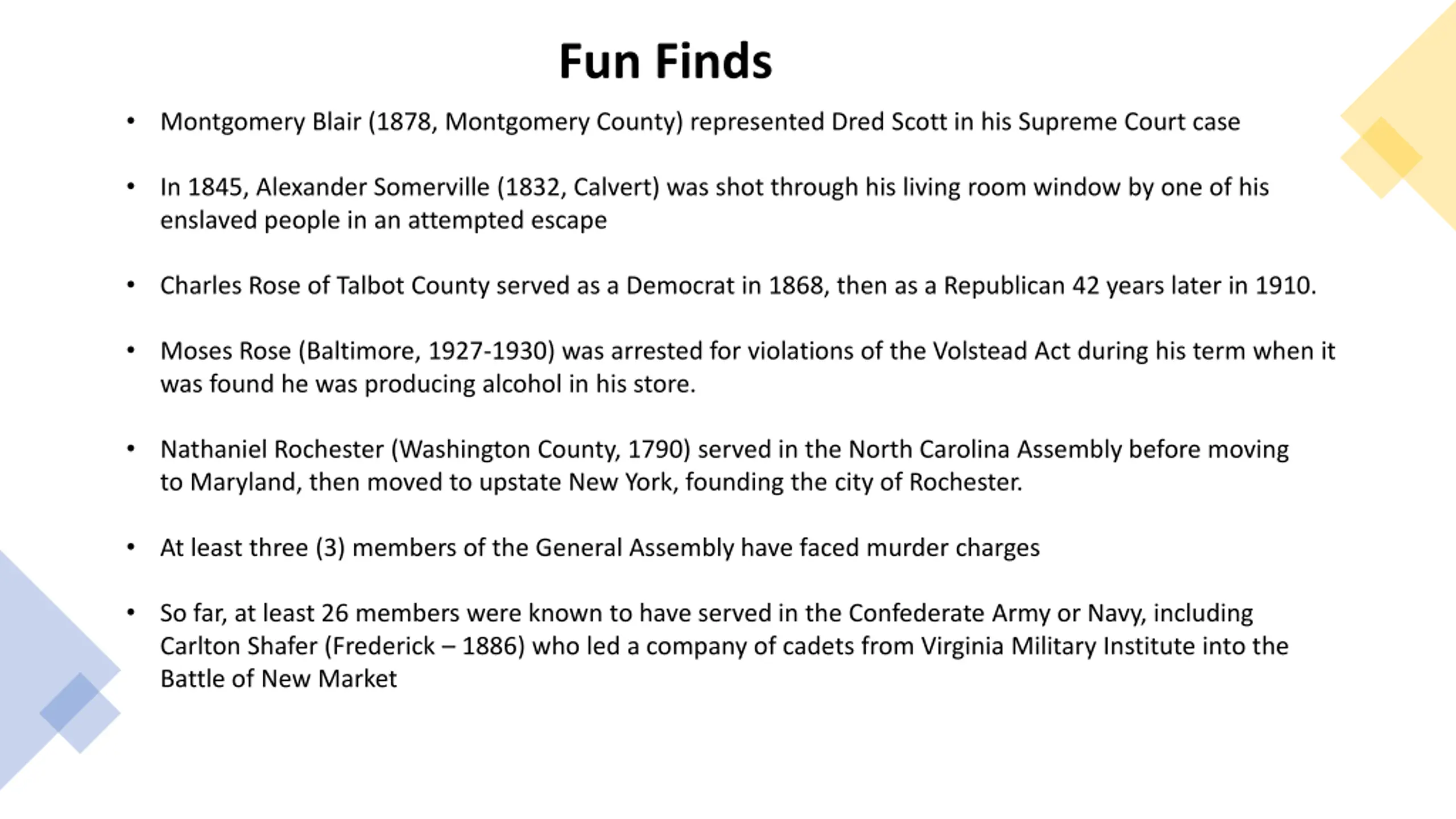 Fun Finds Montgomery Blair (1878, Montgomery County) represented Dred Scott in his Supreme Court case In 1845, Alexander Somerville (1832, Calvert) was shot through his living room window by one of his enslaved people in an attempted escape Charles Rose of Talbot County served as a Democrat in 1868, then as a Republican 42 years later in 1910. Moses Rose (Baltimore, 1927-1930) was arrested for violations of the Volstead Act during his term when it was found he was producing alcohol in his store. Nathaniel Rochester (Washington County, 1790) served in the North Carolina Assembly before moving to Maryland, then moved to upstate New York, founding the city of Rochester. At least three (3) members of the General Assembly have faced murder charges So far, at least 26 members were known to have served in the Confederate Army or Navy, including Carlton Shafer (Frederick 1886) who led a company of cadets from Virginia Military Institute into the Battle of New Market