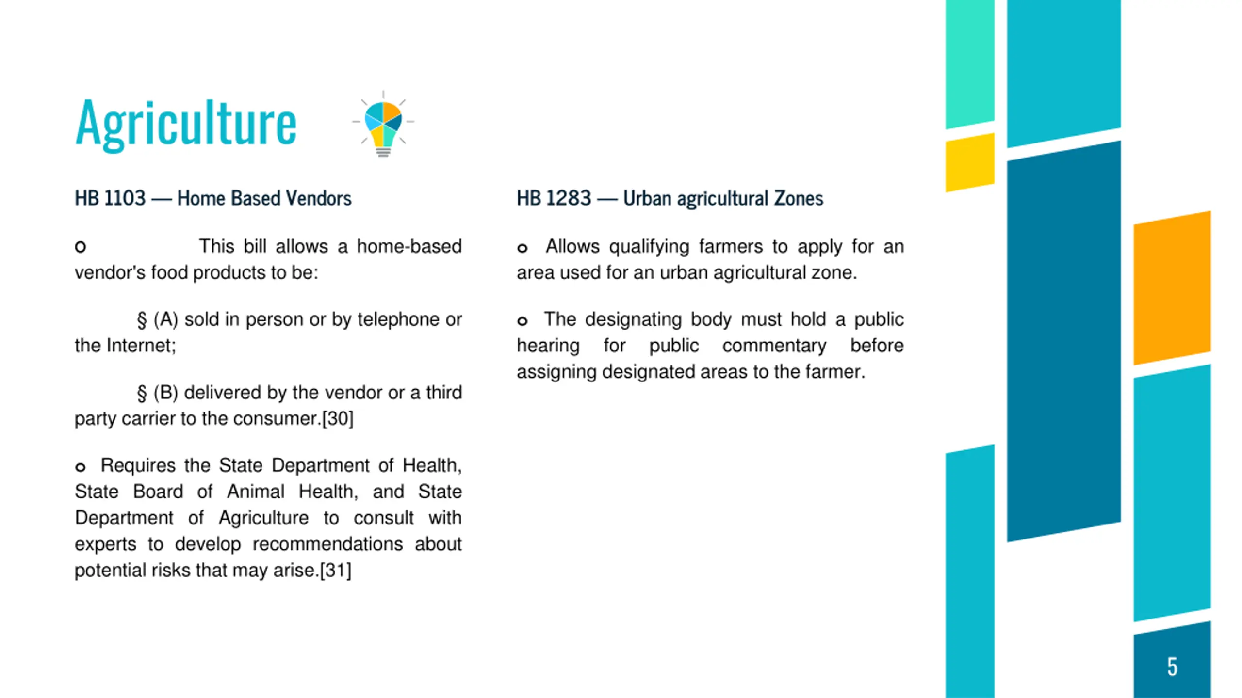 Agriculture HB 1103 Home Based Vendors HB 1283 Urban agricultural Zones This bill allows a home-based Allows qualifying farmers to apply for an O vendor's food products to be: o area used for an urban agricultural zone. (A) sold in person or by telephone or the Internet; o The designating body must hold a public hearing for public assigning designated areas to the farmer. commentary before (B) delivered by the vendor or a third party carrier to the consumer.[30] o Requires the State Department of Health, State Board of Animal Health, and State Department of Agriculture to consult with experts to develop recommendations about potential risks that may arise.[31] 5