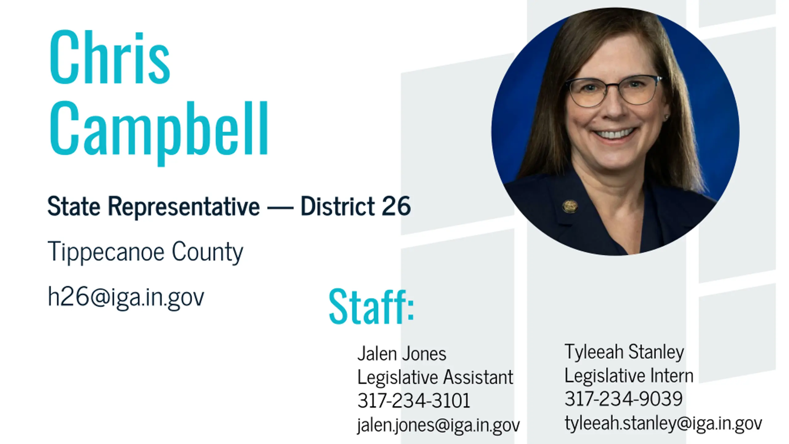 Chris Campbell State Representative District 26 Tippecanoe County h26@iga.in.gov Staff: Tyleeah Stanley Legislative Intern 317-234-9039 tyleeah.stanley@iga.in.gov Jalen Jones Legislative Assistant 317-234-3101 jalen.jones@iga.in.gov 2