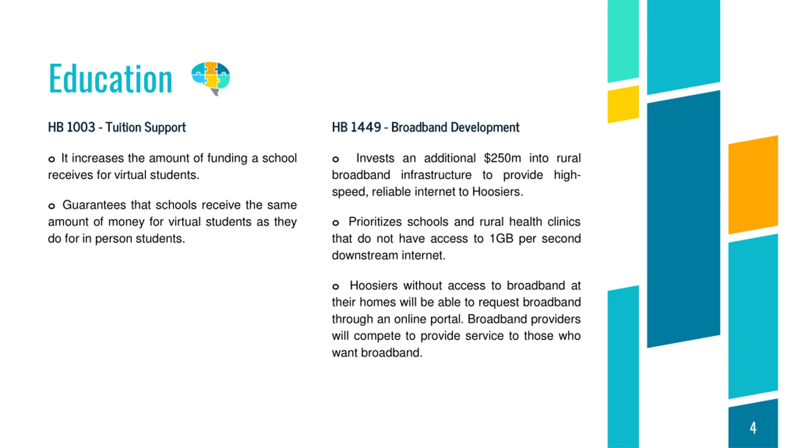 Education HB 1003 - Tuition Support HB 1449 - Broadband Development o It increases the amount of funding a school receives for virtual students. Invests an additional $250m into rural o broadband infrastructure to provide high- speed, reliable internet to Hoosiers. o Guarantees that schools receive the same amount of money for virtual students as they do for in person students. o Prioritizes schools and rural health clinics that do not have access to 1GB per second downstream internet. o Hoosiers without access to broadband at their homes will be able to request broadband through an online portal. Broadband providers will compete to provide service to those who want broadband. 4