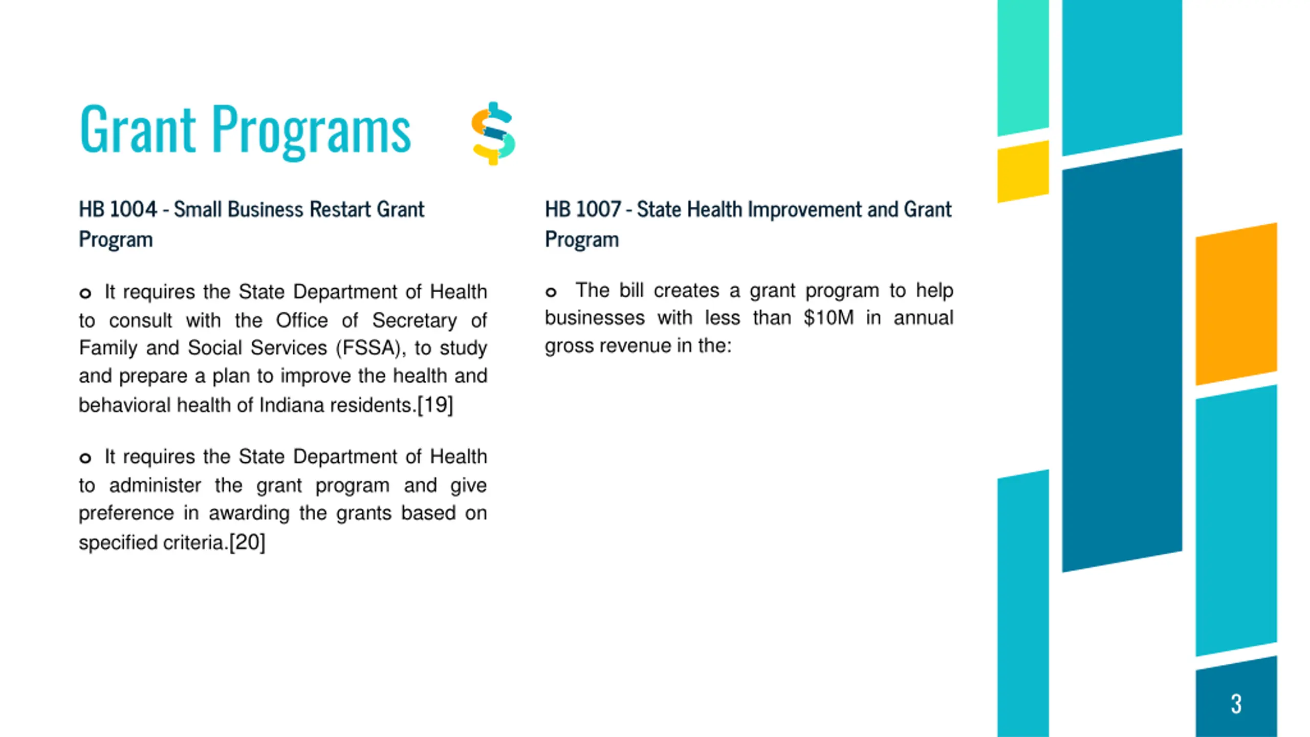 Grant Programs HB 1004 - Small Business Restart Grant Program HB 1007 - State Health Improvement and Grant Program The bill creates a grant program to help o It requires the State Department of Health to consult with the Office of Secretary of Family and Social Services (FSSA), to study and prepare a plan to improve the health and behavioral health of Indiana residents.[19] o businesses with less than $10M in annual gross revenue in the: o It requires the State Department of Health to administer the grant program and give preference in awarding the grants based on specified criteria.[20] 3