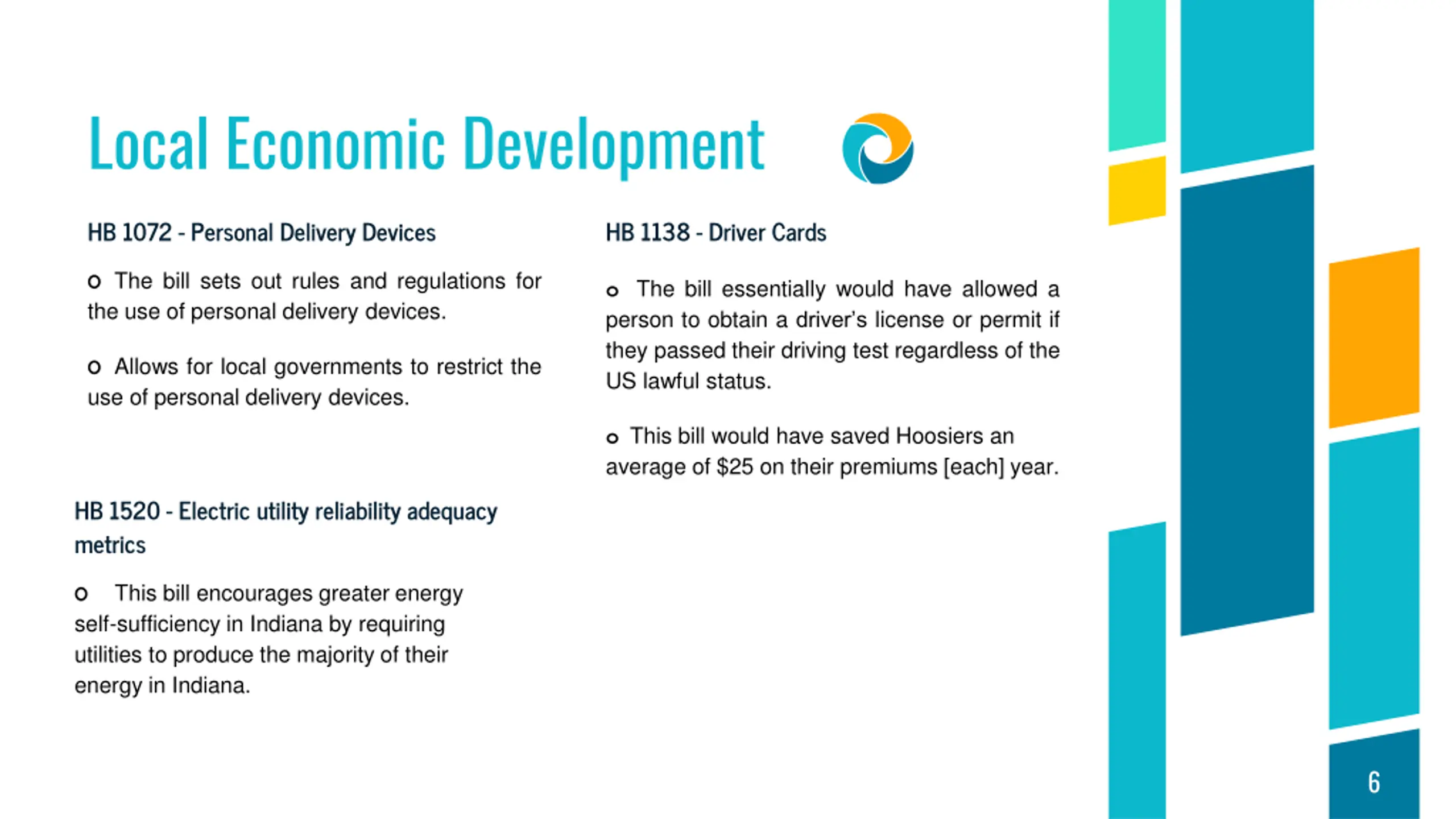 Local Economic Development HB 1072 - Personal Delivery Devices HB 1138 - Driver Cards O The bill sets out rules and regulations for the use of personal delivery devices. o The bill essentially would have allowed a person to obtain a driver s license or permit if they passed their driving test regardless of the US lawful status. O Allows for local governments to restrict the use of personal delivery devices. o This bill would have saved Hoosiers an average of $25 on their premiums [each] year. HB 1520 - Electric utility reliability adequacy metrics O This bill encourages greater energy self-sufficiency in Indiana by requiring utilities to produce the majority of their energy in Indiana. 6