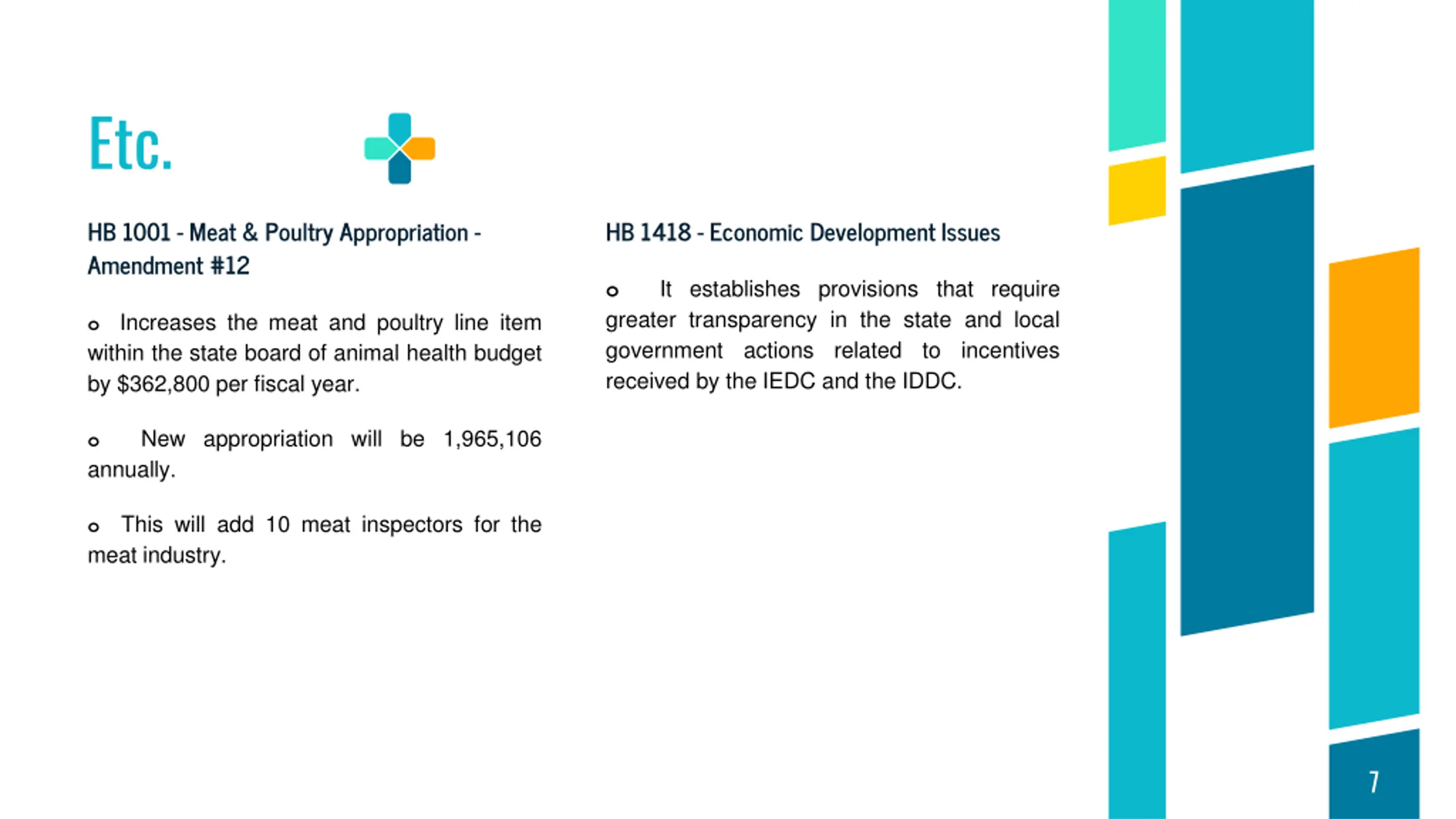 Etc. HB 1001 - Meat & Poultry Appropriation - Amendment #12 HB 1418 - Economic Development Issues It establishes provisions that require o greater transparency in the state and local government actions received by the IEDC and the IDDC. Increases the meat and poultry line item o within the state board of animal health budget by $362,800 per fiscal year. related to incentives New appropriation will be 1,965,106 o annually. This will add 10 meat inspectors for the o meat industry. 7