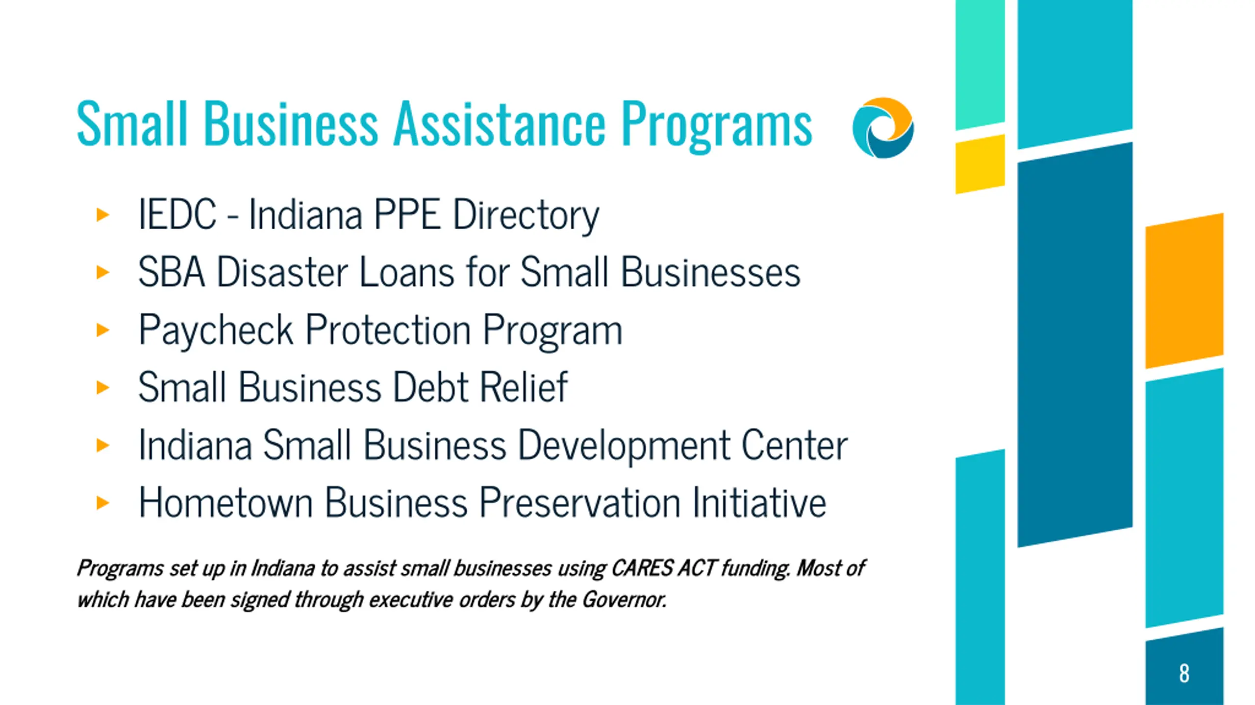 Small Business Assistance Programs IEDC - Indiana PPE Directory SBA Disaster Loans for Small Businesses Paycheck Protection Program Small Business Debt Relief Indiana Small Business Development Center Hometown Business Preservation Initiative Programs set up in Indiana to assist small businesses using CARES ACT funding. Most of which have been signed through executive orders by the Governor. 8