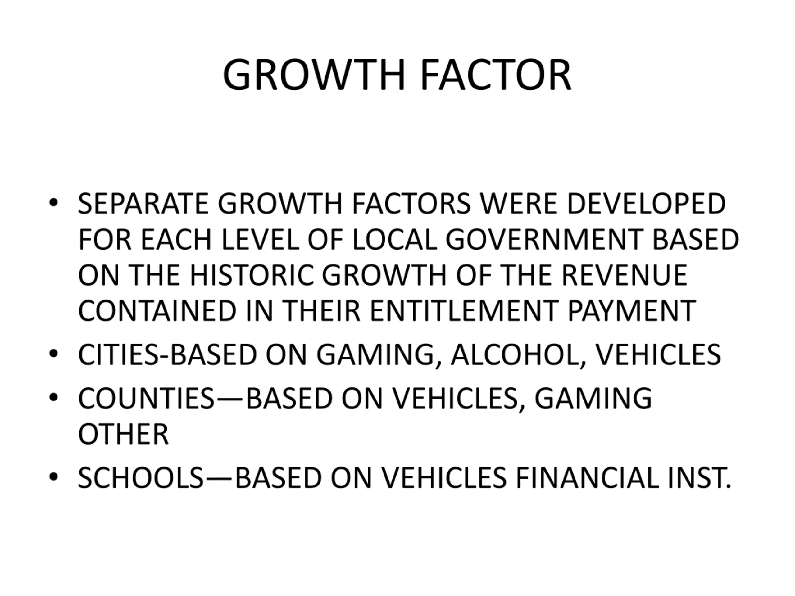 GROWTH FACTOR SEPARATE GROWTH FACTORS WERE DEVELOPED FOR EACH LEVEL OF LOCAL GOVERNMENT BASED ON THE HISTORIC GROWTH OF THE REVENUE CONTAINED IN THEIR ENTITLEMENT PAYMENT CITIES-BASED ON GAMING, ALCOHOL, VEHICLES COUNTIES BASED ON VEHICLES, GAMING OTHER SCHOOLS BASED ON VEHICLES FINANCIAL INST.