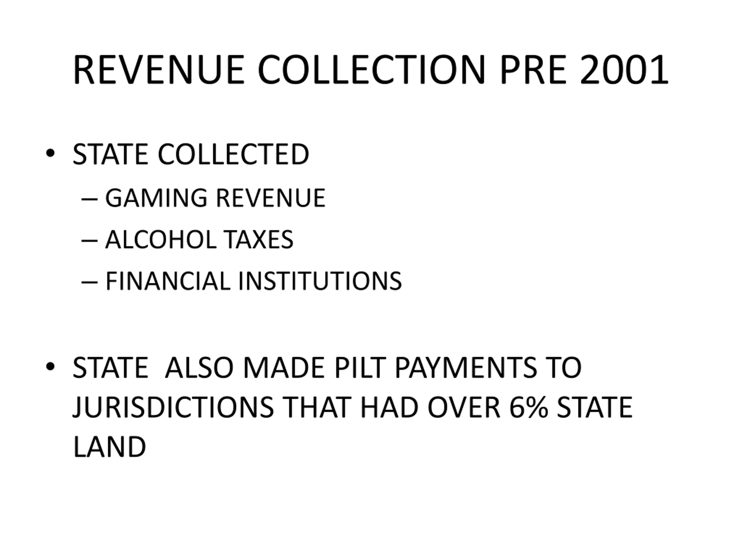 REVENUE COLLECTION PRE 2001 STATE COLLECTED GAMING REVENUE ALCOHOL TAXES FINANCIAL INSTITUTIONS STATE ALSO MADE PILT PAYMENTS TO JURISDICTIONS THAT HAD OVER 6% STATE LAND