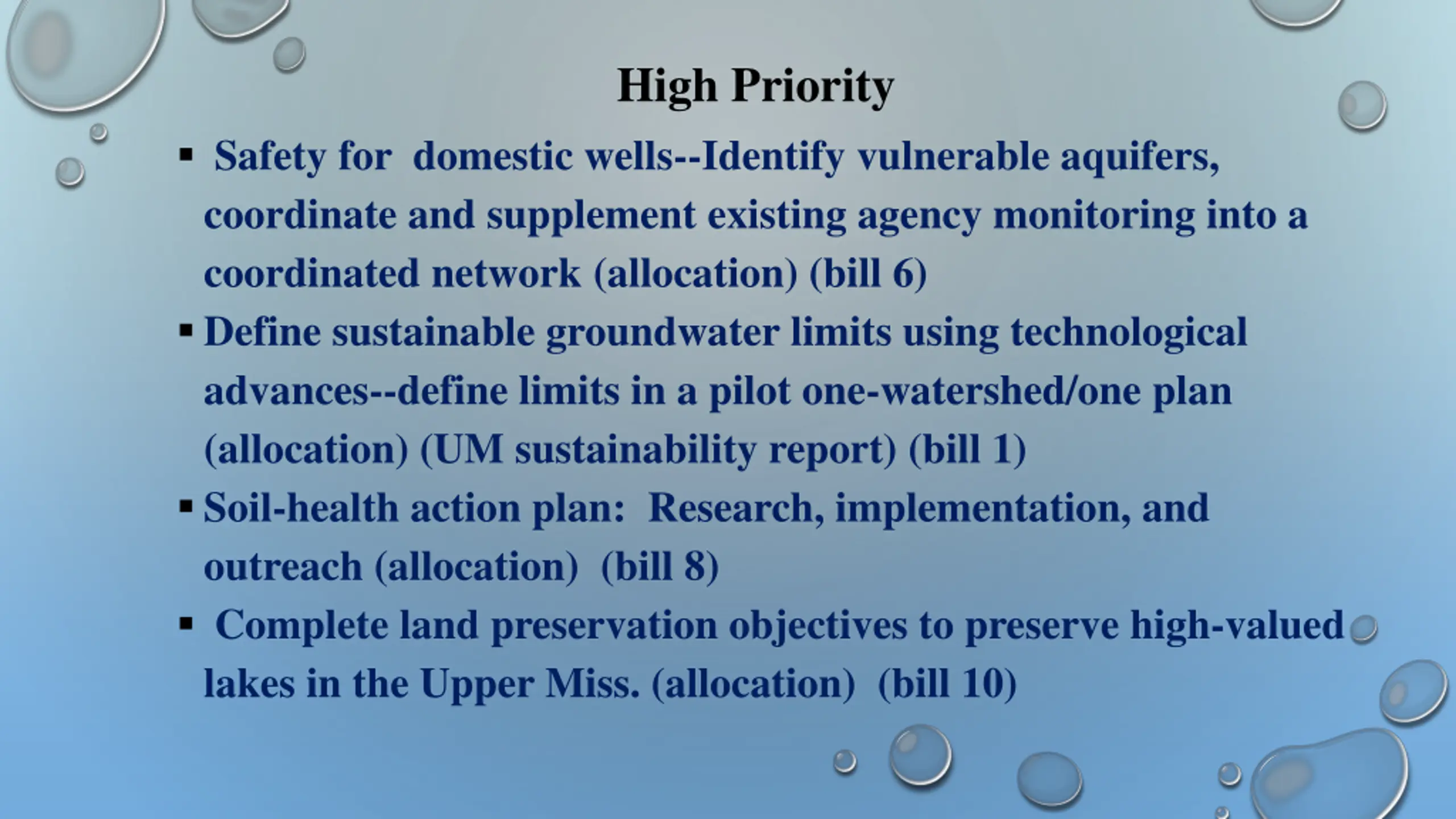 High Priority Safety for domestic wells--Identify vulnerable aquifers, coordinate and supplement existing agency monitoring into a coordinated network (allocation) (bill 6) Define sustainable groundwater limits using technological advances--define limits in a pilot one-watershed/one plan (allocation) (UM sustainability report) (bill 1) Soil-health action plan: Research, implementation, and outreach (allocation) (bill 8) Complete land preservation objectives to preserve high-valued lakes in the Upper Miss. (allocation) (bill 10)