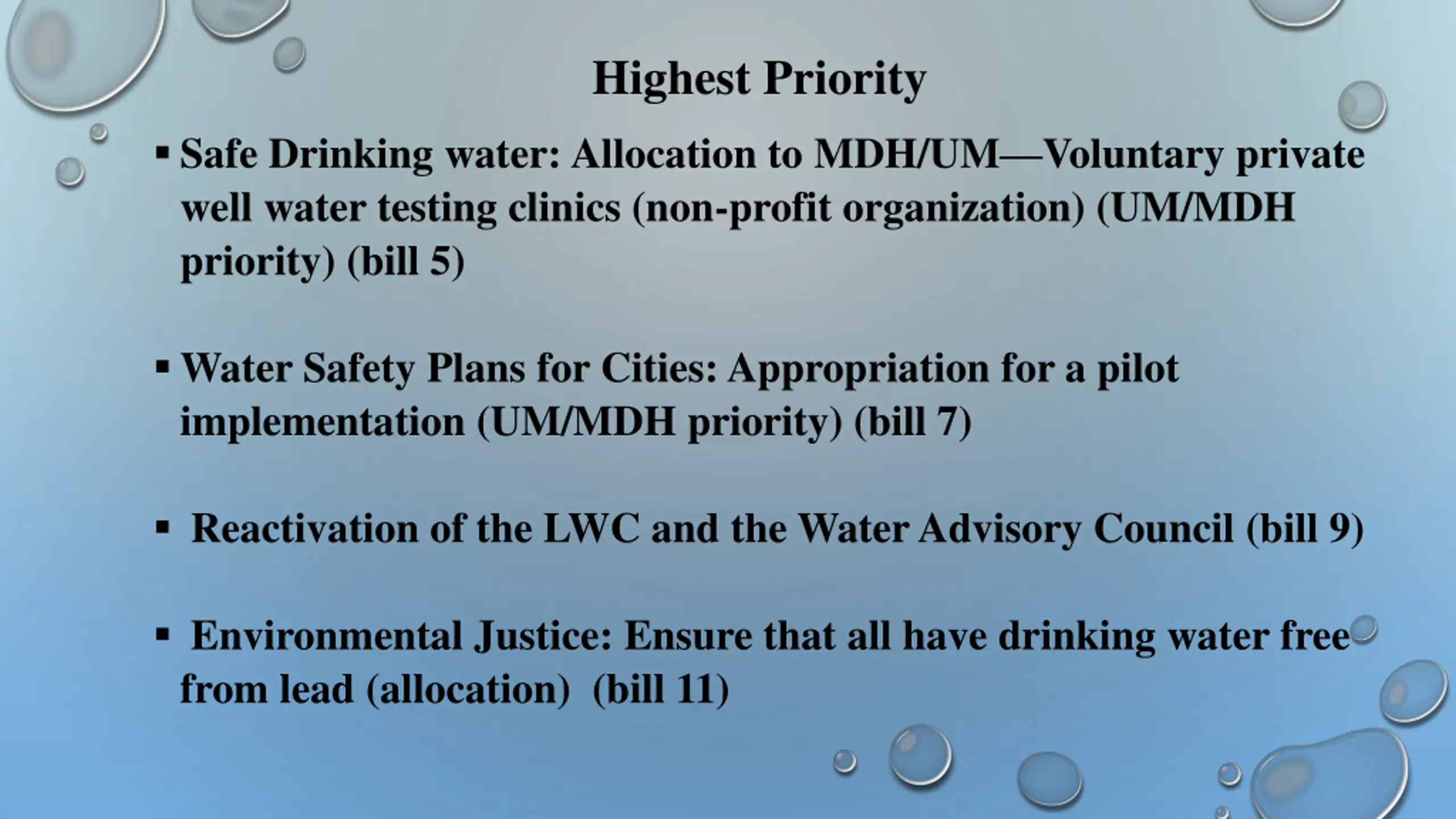 Highest Priority Safe Drinking water: Allocation to MDH/UM Voluntary private well water testing clinics (non-profit organization) (UM/MDH priority) (bill 5) Water Safety Plans for Cities: Appropriation for a pilot implementation (UM/MDH priority) (bill 7) Reactivation of the LWC and the Water Advisory Council (bill 9) Environmental Justice: Ensure that all have drinking water free from lead (allocation) (bill 11)