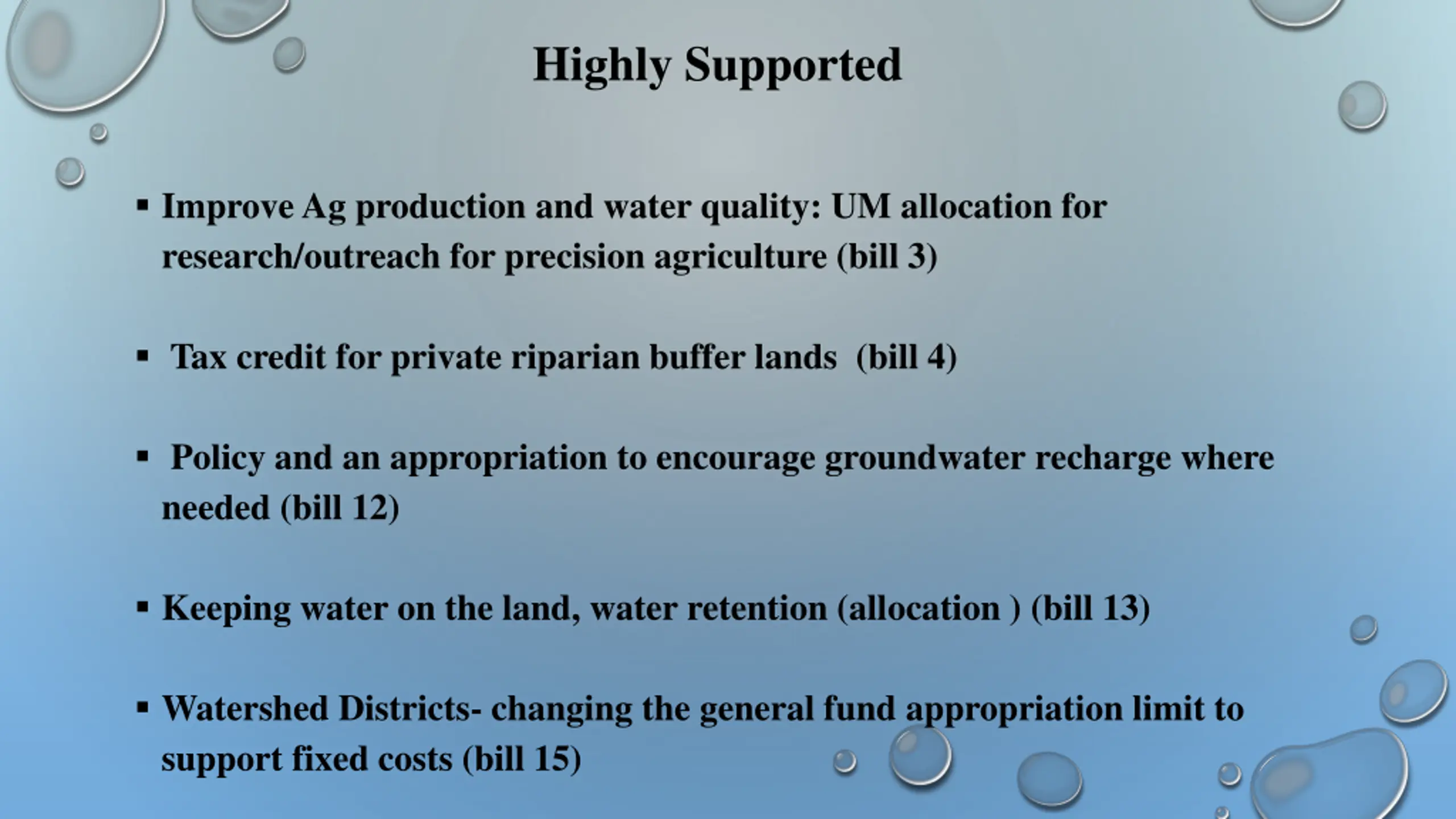 Highly Supported Improve Ag production and water quality: UM allocation for research/outreach for precision agriculture (bill 3) Tax credit for private riparian buffer lands (bill 4) Policy and an appropriation to encourage groundwater recharge where needed (bill 12) Keeping water on the land, water retention (allocation ) (bill 13) Watershed Districts- changing the general fund appropriation limit to support fixed costs (bill 15)