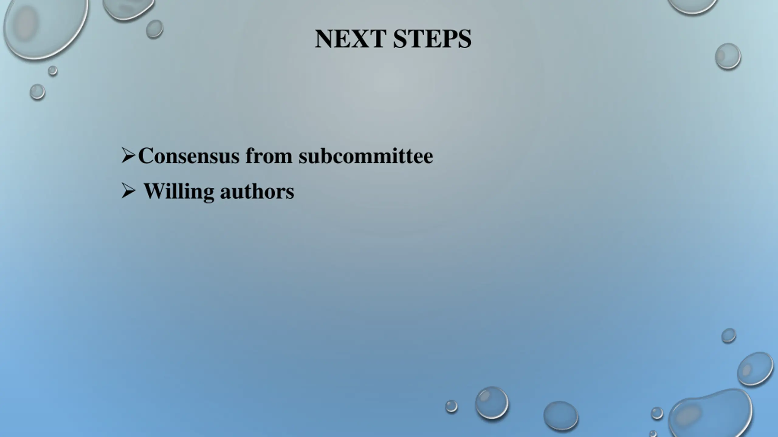 NEXT STEPS Consensus from subcommittee Willing authors