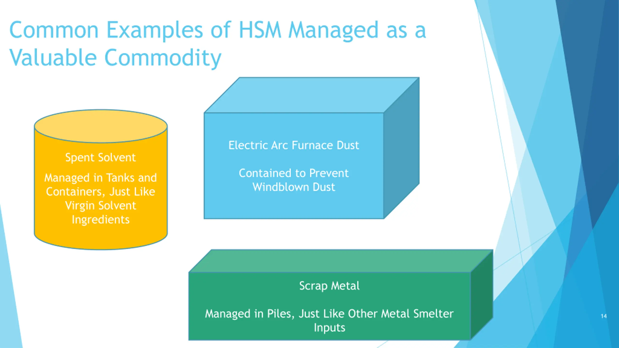 Common Examples of HSM Managed as a Valuable Commodity Electric Arc Furnace Dust Spent Solvent Contained to Prevent Windblown Dust Managed in Tanks and Containers, Just Like Virgin Solvent Ingredients Scrap Metal Managed in Piles, Just Like Other Metal Smelter Inputs 14