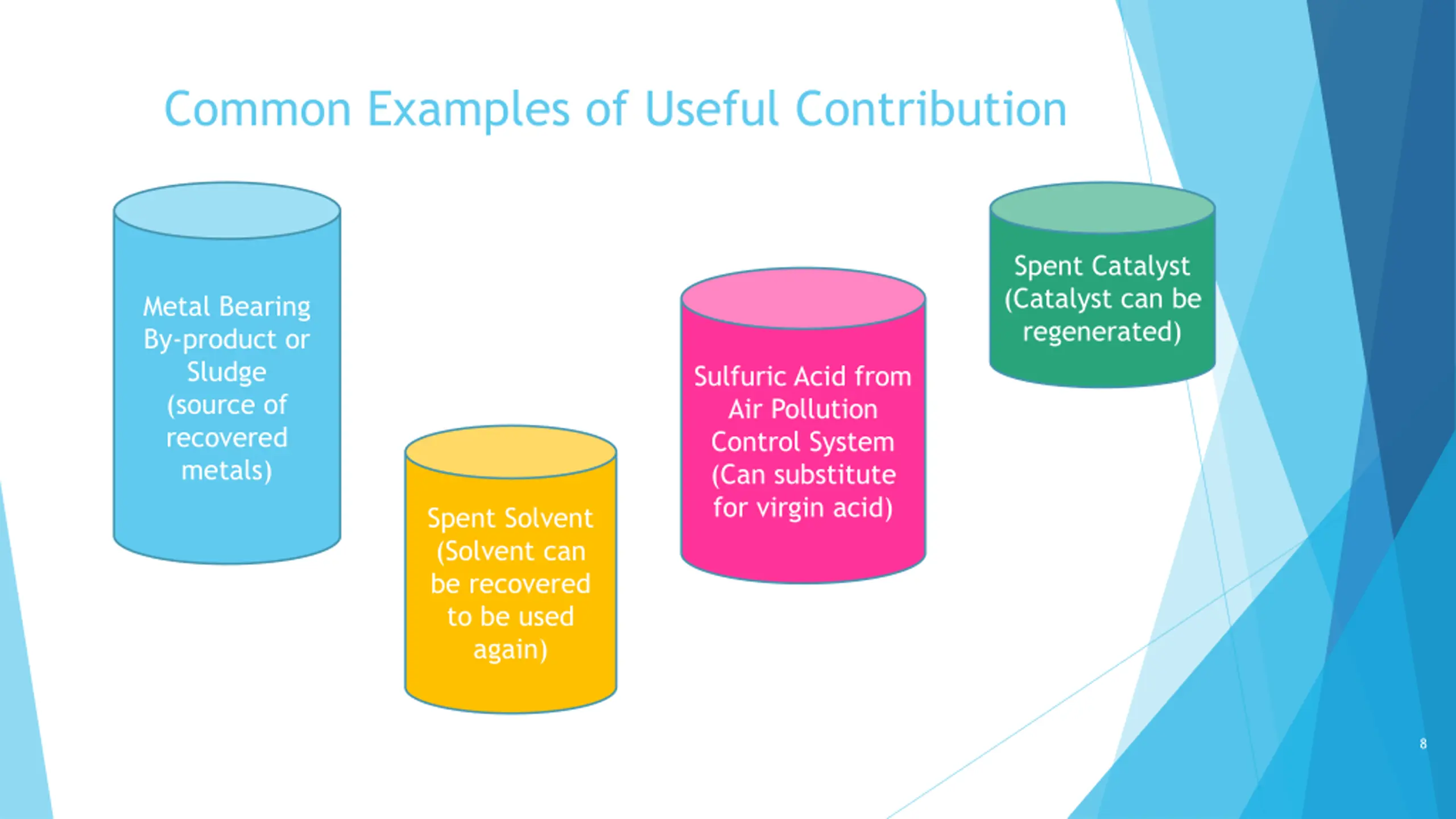Common Examples of Useful Contribution Spent Catalyst (Catalyst can be regenerated) Metal Bearing By-product or Sludge (source of recovered metals) Sulfuric Acid from Air Pollution Control System (Can substitute for virgin acid) Spent Solvent (Solvent can be recovered to be used again) 8