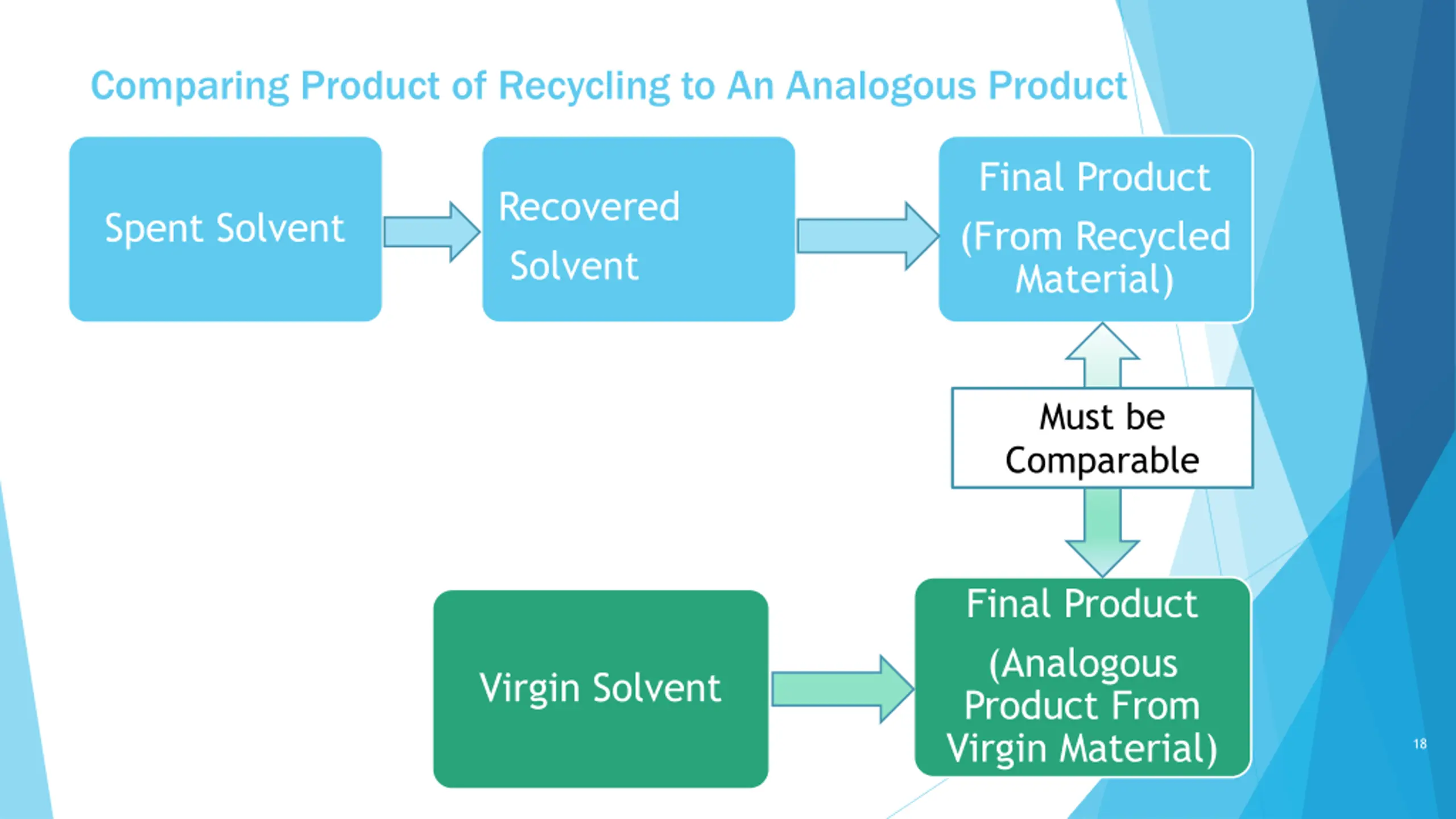 Comparing Product of Recycling to An Analogous Product Final Product (From Recycled Material) Recovered Solvent Spent Solvent Must be Comparable Final Product (Analogous Product From Virgin Material) Virgin Solvent 18