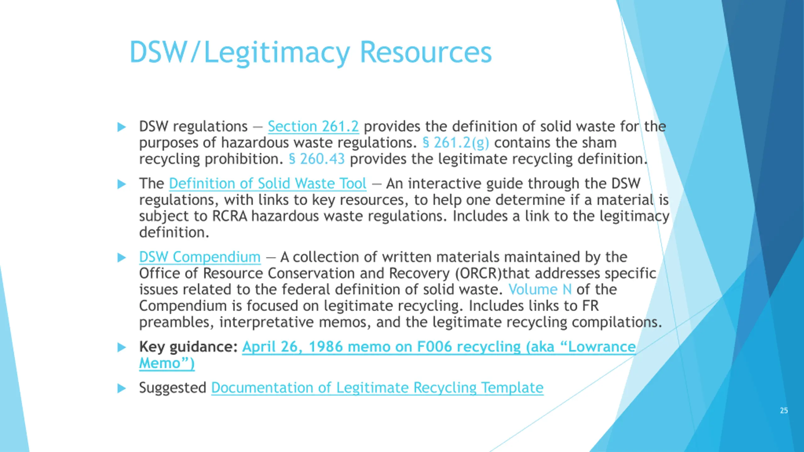 DSW/Legitimacy Resources DSW regulations Section 261.2 provides the definition of solid waste for the purposes of hazardous waste regulations. 261.2(g) contains the sham recycling prohibition. 260.43 provides the legitimate recycling definition. The Definition of Solid Waste Tool An interactive guide through the DSW regulations, with links to key resources, to help one determine if a material is subject to RCRA hazardous waste regulations. Includes a link to the legitimacy definition. DSW Compendium A collection of written materials maintained by the Office of Resource Conservation and Recovery (ORCR)that addresses specific issues related to the federal definition of solid waste. Volume N of the Compendium is focused on legitimate recycling. Includes links to FR preambles, interpretative memos, and the legitimate recycling compilations. Key guidance: April 26, 1986 memo on F006 recycling (aka Lowrance Memo ) Suggested Documentation of Legitimate Recycling Template 25
