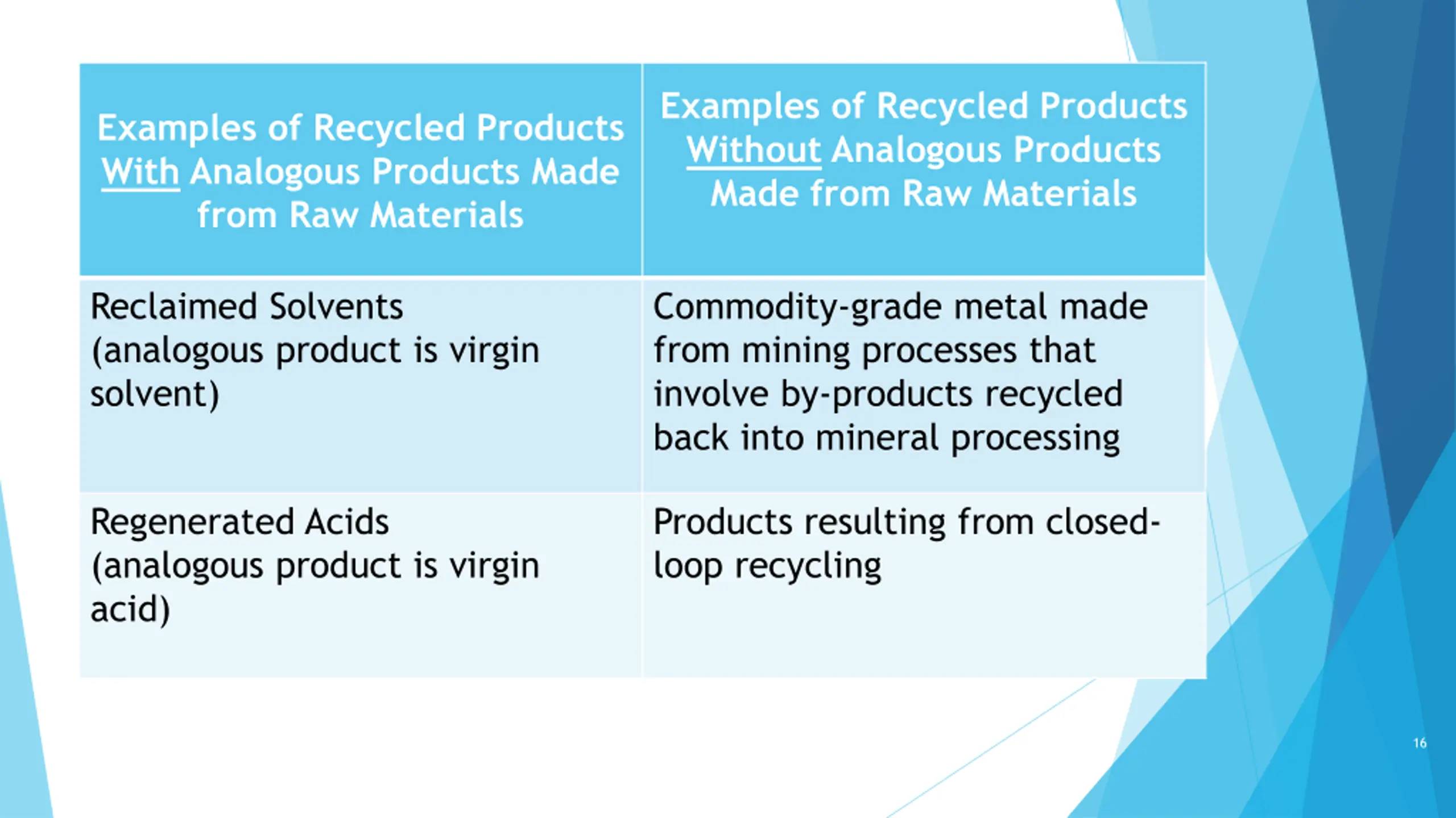 Examples of Recycled Products Without Analogous Products Made from Raw Materials Examples of Recycled Products With Analogous Products Made from Raw Materials Reclaimed Solvents (analogous product is virgin solvent) Commodity-grade metal made from mining processes that involve by-products recycled back into mineral processing Regenerated Acids (analogous product is virgin acid) Products resulting from closed- loop recycling 16