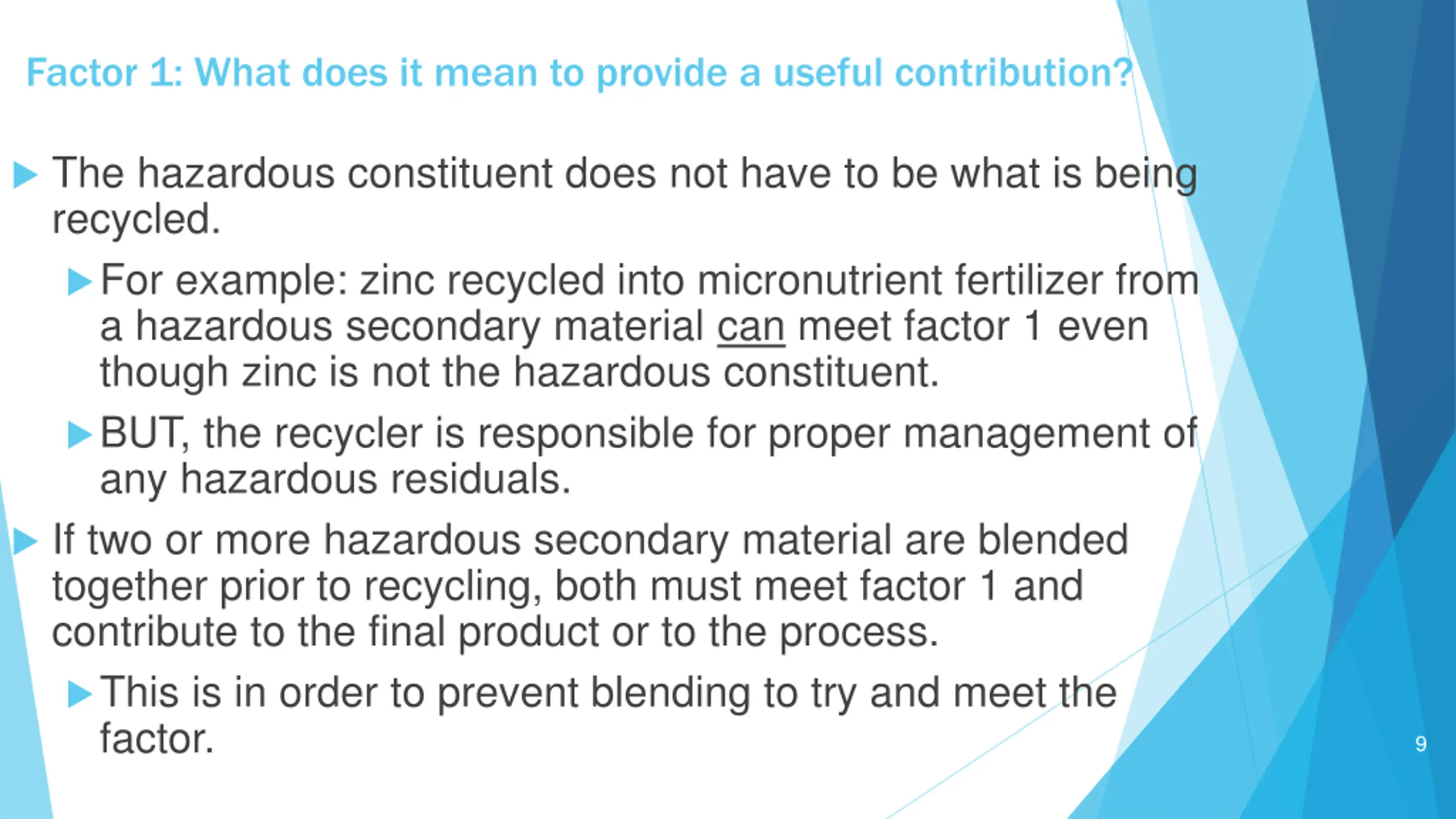 Factor 1: What does it mean to provide a useful contribution? The hazardous constituent does not have to be what is being recycled. For example: zinc recycled into micronutrient fertilizer from a hazardous secondary material can meet factor 1 even though zinc is not the hazardous constituent. BUT, the recycler is responsible for proper management of any hazardous residuals. If two or more hazardous secondary material are blended together prior to recycling, both must meet factor 1 and contribute to the final product or to the process. This is in order to prevent blending to try and meet the factor. 9