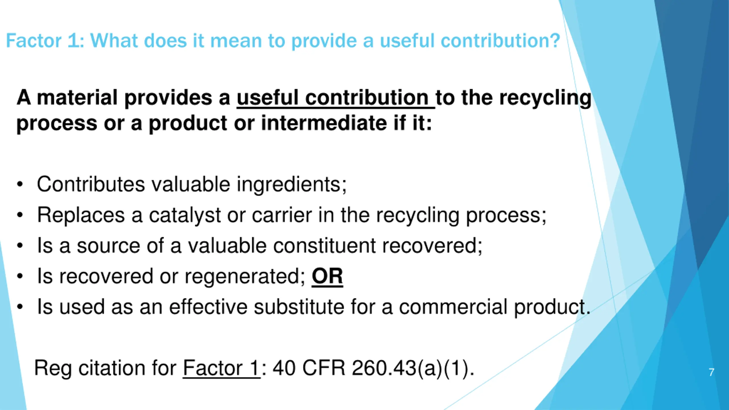 Factor 1: What does it mean to provide a useful contribution? A material provides a useful contribution to the recycling process or a product or intermediate if it: Contributes valuable ingredients; Replaces a catalyst or carrier in the recycling process; Is a source of a valuable constituent recovered; Is recovered or regenerated; OR Is used as an effective substitute for a commercial product. Reg citation for Factor 1: 40 CFR 260.43(a)(1). 7