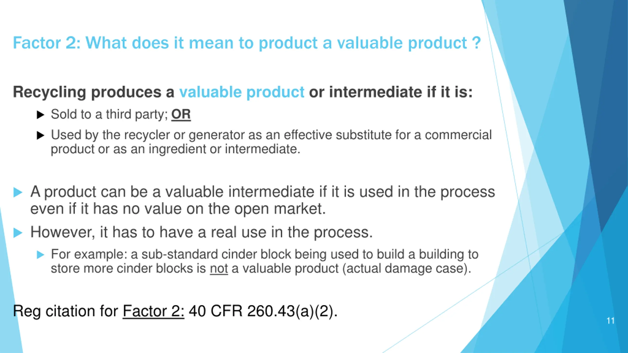 Factor 2: What does it mean to product a valuable product ? Recycling produces a valuable product or intermediate if it is: Sold to a third party; OR Used by the recycler or generator as an effective substitute for a commercial product or as an ingredient or intermediate. A product can be a valuable intermediate if it is used in the process even if it has no value on the open market. However, it has to have a real use in the process. For example: a sub-standard cinder block being used to build a building to store more cinder blocks is not a valuable product (actual damage case). Reg citation for Factor 2: 40 CFR 260.43(a)(2). 11