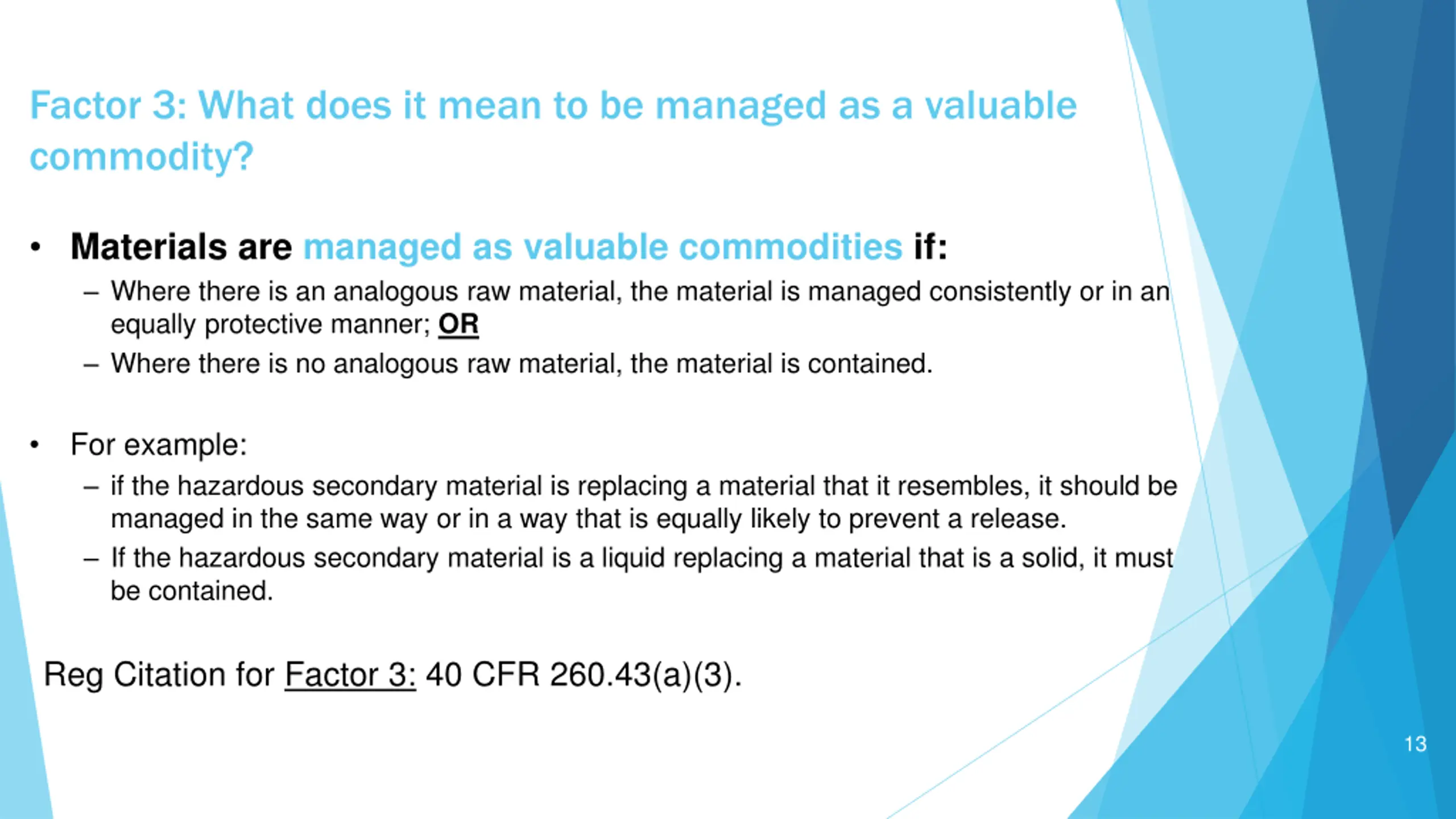 Factor 3: What does it mean to be managed as a valuable commodity? Materials are managed as valuable commodities if: Where there is an analogous raw material, the material is managed consistently or in an equally protective manner; OR Where there is no analogous raw material, the material is contained. For example: if the hazardous secondary material is replacing a material that it resembles, it should be managed in the same way or in a way that is equally likely to prevent a release. If the hazardous secondary material is a liquid replacing a material that is a solid, it must be contained. Reg Citation for Factor 3: 40 CFR 260.43(a)(3). 13
