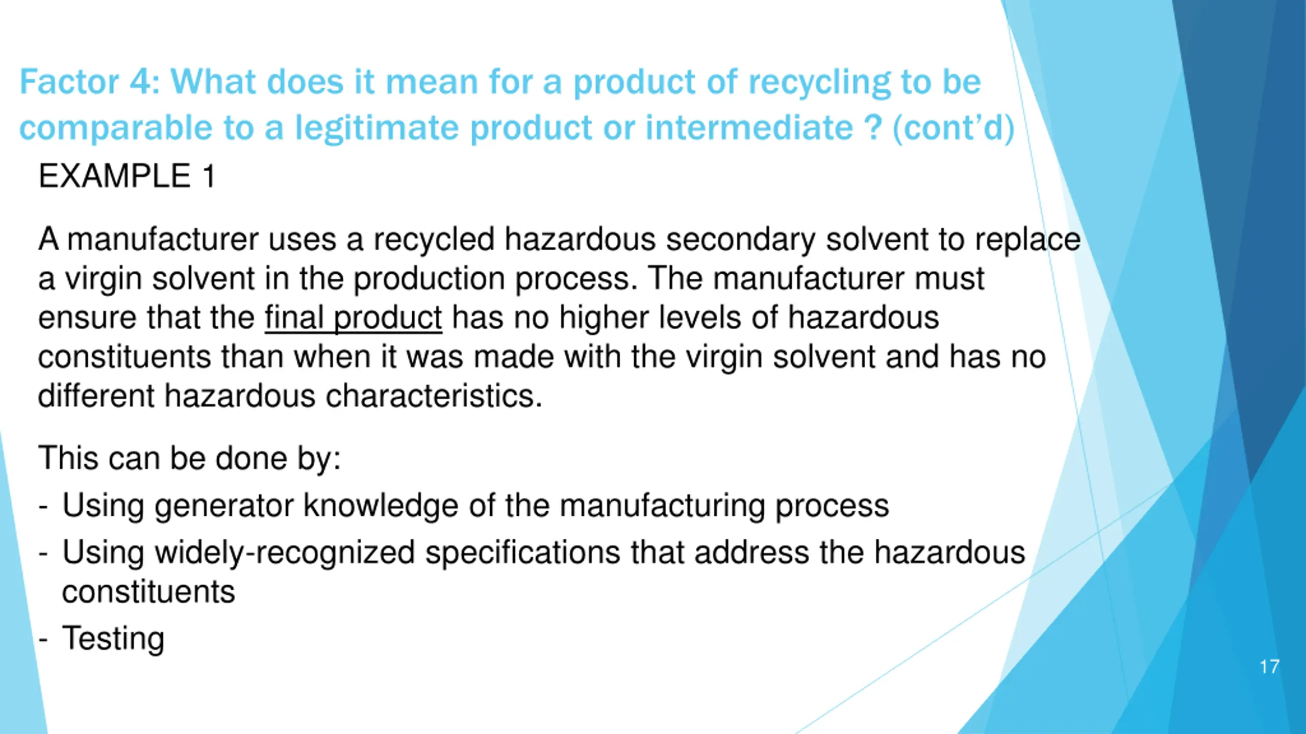 Factor 4: What does it mean for a product of recycling to be comparable to a legitimate product or intermediate ? (cont d) EXAMPLE 1 A manufacturer uses a recycled hazardous secondary solvent to replace a virgin solvent in the production process. The manufacturer must ensure that the final product has no higher levels of hazardous constituents than when it was made with the virgin solvent and has no different hazardous characteristics. This can be done by: - Using generator knowledge of the manufacturing process - Using widely-recognized specifications that address the hazardous constituents - Testing 17