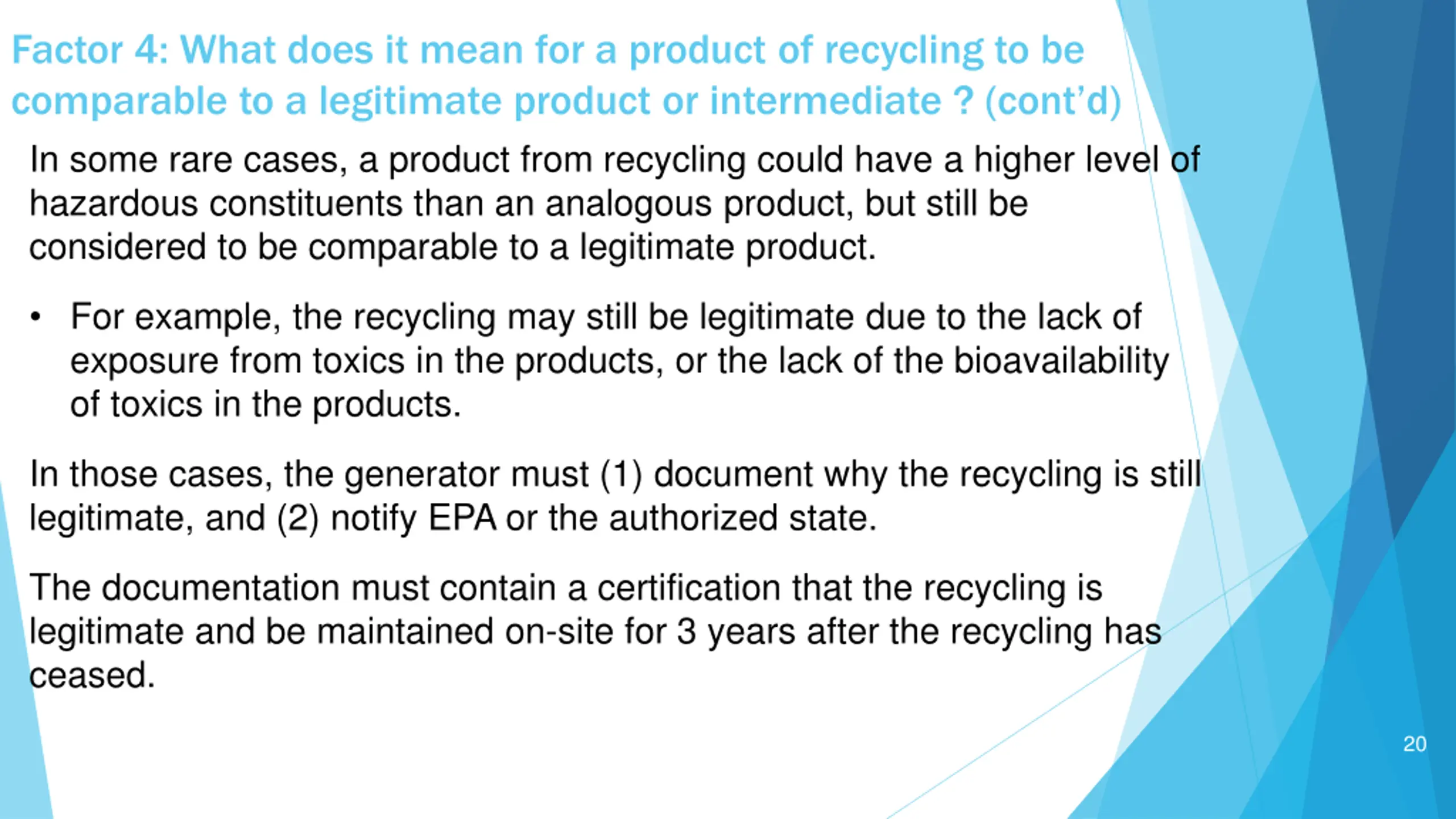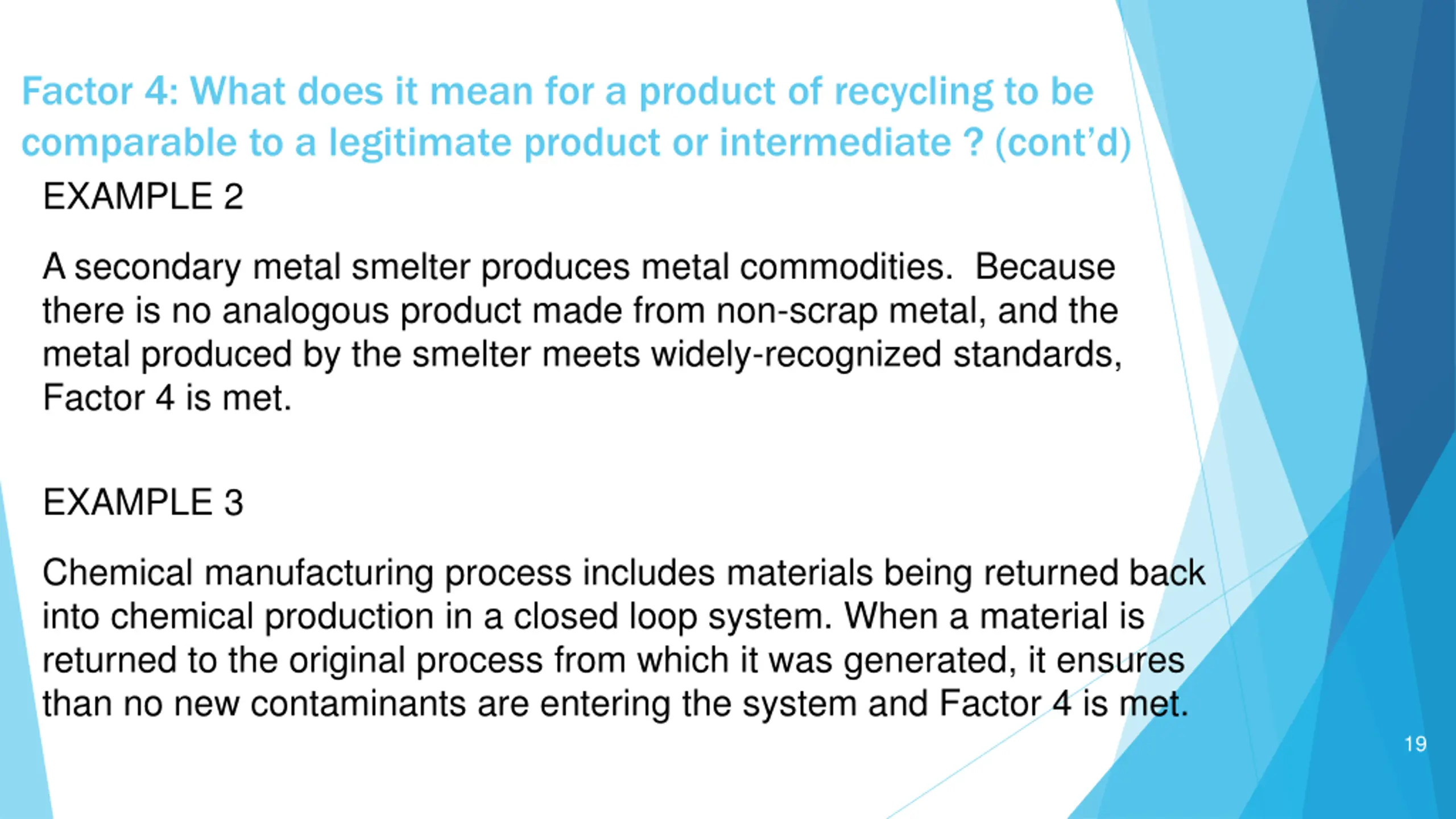 Factor 4: What does it mean for a product of recycling to be comparable to a legitimate product or intermediate ? (cont d) EXAMPLE 2 A secondary metal smelter produces metal commodities. Because there is no analogous product made from non-scrap metal, and the metal produced by the smelter meets widely-recognized standards, Factor 4 is met. EXAMPLE 3 Chemical manufacturing process includes materials being returned back into chemical production in a closed loop system. When a material is returned to the original process from which it was generated, it ensures than no new contaminants are entering the system and Factor 4 is met. 19