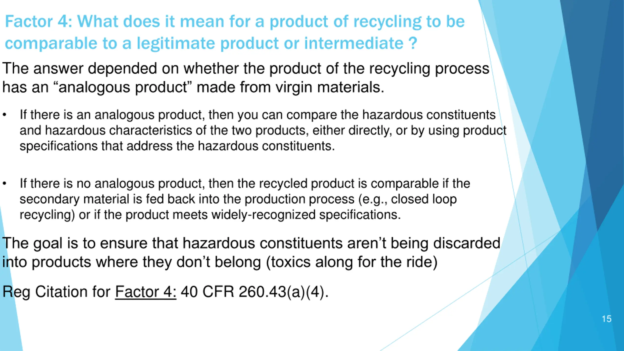 Factor 4: What does it mean for a product of recycling to be comparable to a legitimate product or intermediate ? The answer depended on whether the product of the recycling process has an analogous product made from virgin materials. If there is an analogous product, then you can compare the hazardous constituents and hazardous characteristics of the two products, either directly, or by using product specifications that address the hazardous constituents. If there is no analogous product, then the recycled product is comparable if the secondary material is fed back into the production process (e.g., closed loop recycling) or if the product meets widely-recognized specifications. The goal is to ensure that hazardous constituents aren t being discarded into products where they don t belong (toxics along for the ride) Reg Citation for Factor 4: 40 CFR 260.43(a)(4). 15