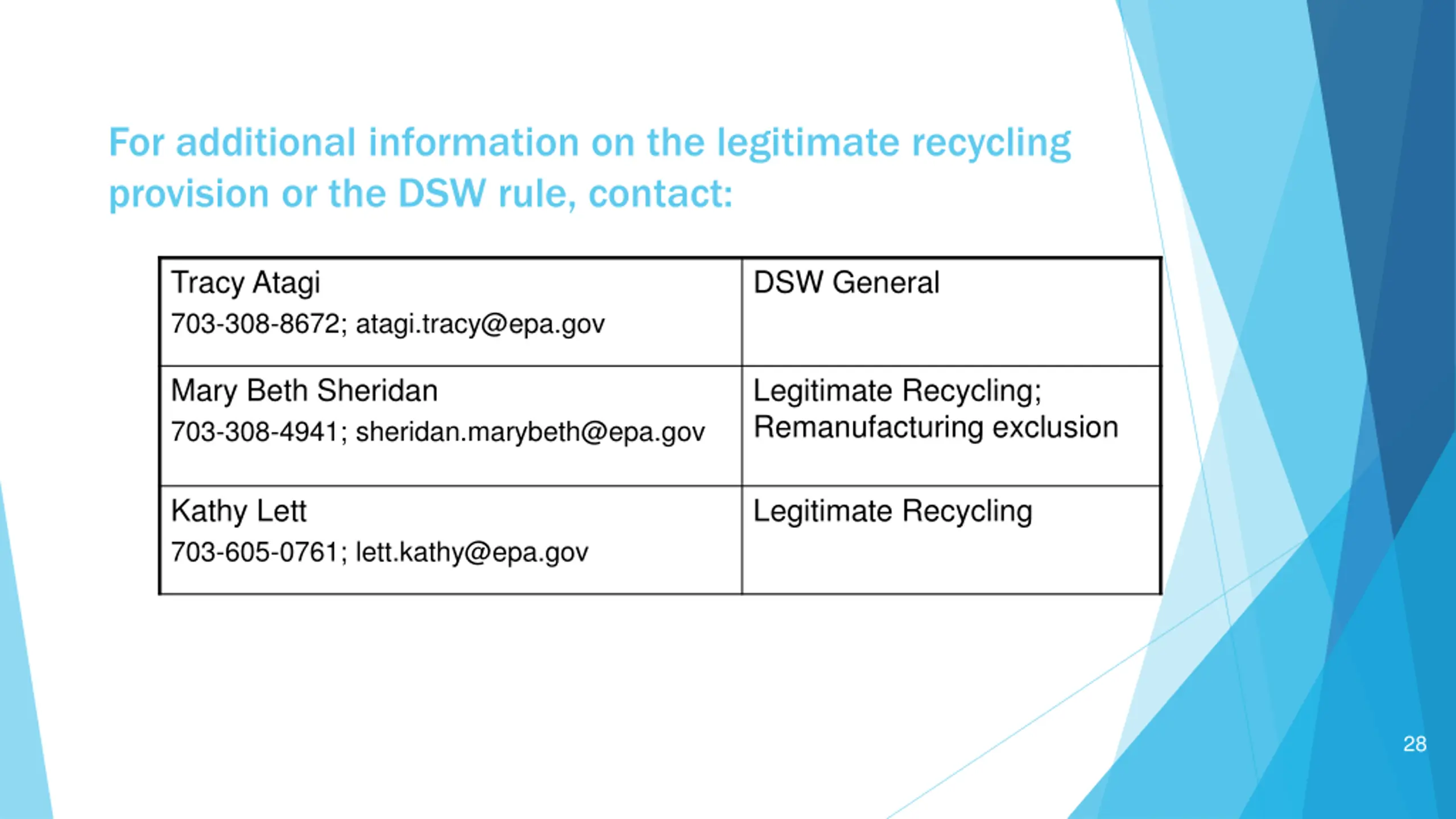 For additional information on the legitimate recycling provision or the DSW rule, contact: Tracy Atagi 703-308-8672; atagi.tracy@epa.gov DSW General Mary Beth Sheridan 703-308-4941; sheridan.marybeth@epa.gov Legitimate Recycling; Remanufacturing exclusion Kathy Lett 703-605-0761; lett.kathy@epa.gov Legitimate Recycling 28