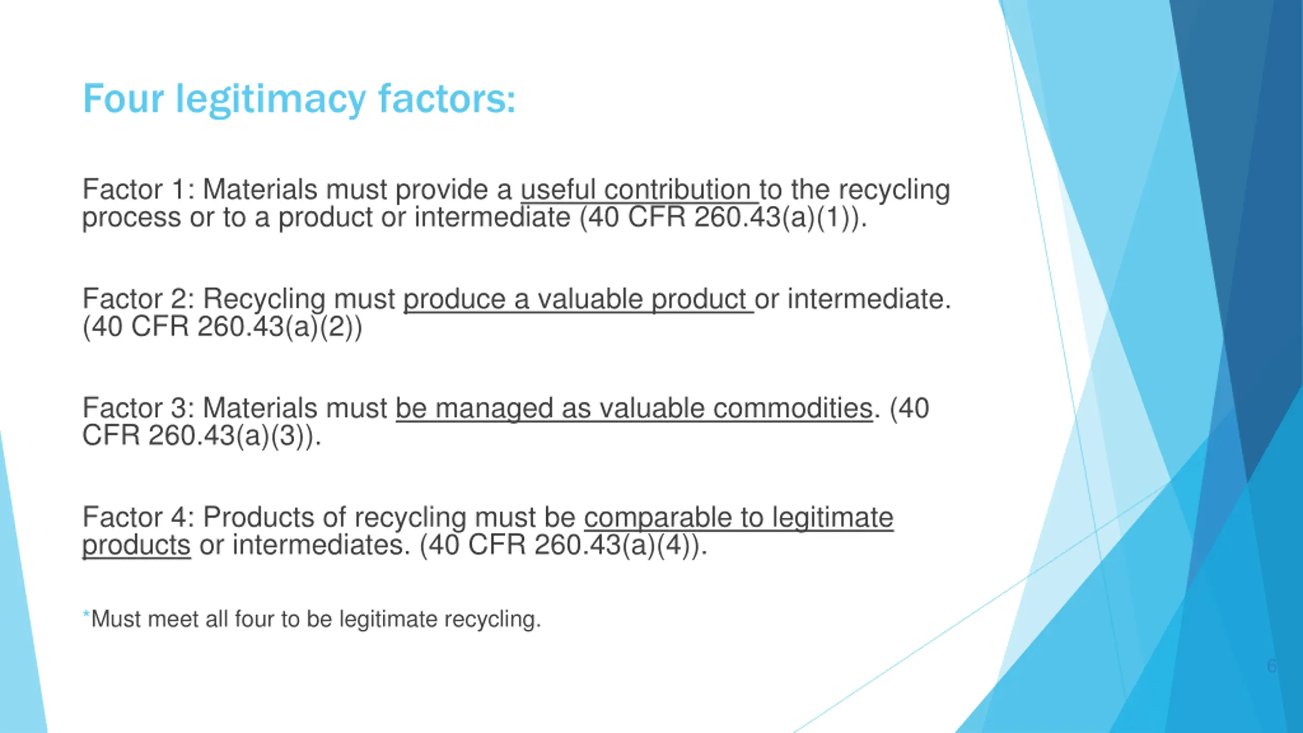 Four legitimacy factors: Factor 1: Materials must provide a useful contribution to the recycling process or to a product or intermediate (40 CFR 260.43(a)(1)). Factor 2: Recycling must produce a valuable product or intermediate. (40 CFR 260.43(a)(2)) Factor 3: Materials must be managed as valuable commodities. (40 CFR 260.43(a)(3)). Factor 4: Products of recycling must be comparable to legitimate products or intermediates. (40 CFR 260.43(a)(4)). *Must meet all four to be legitimate recycling. 6