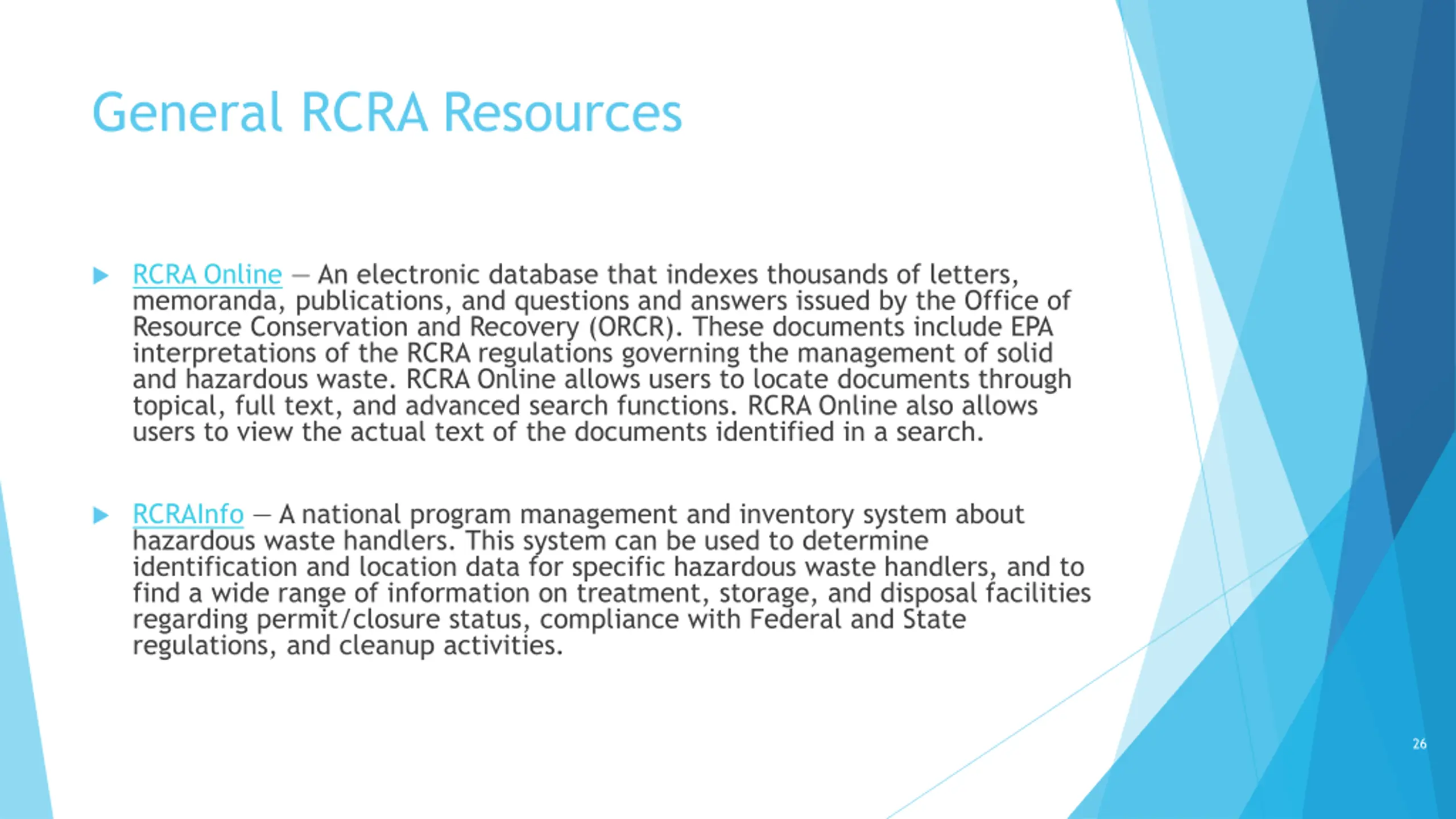 General RCRA Resources RCRA Online An electronic database that indexes thousands of letters, memoranda, publications, and questions and answers issued by the Office of Resource Conservation and Recovery (ORCR). These documents include EPA interpretations of the RCRA regulations governing the management of solid and hazardous waste. RCRA Online allows users to locate documents through topical, full text, and advanced search functions. RCRA Online also allows users to view the actual text of the documents identified in a search. RCRAInfo A national program management and inventory system about hazardous waste handlers. This system can be used to determine identification and location data for specific hazardous waste handlers, and to find a wide range of information on treatment, storage, and disposal facilities regarding permit/closure status, compliance with Federal and State regulations, and cleanup activities. 26