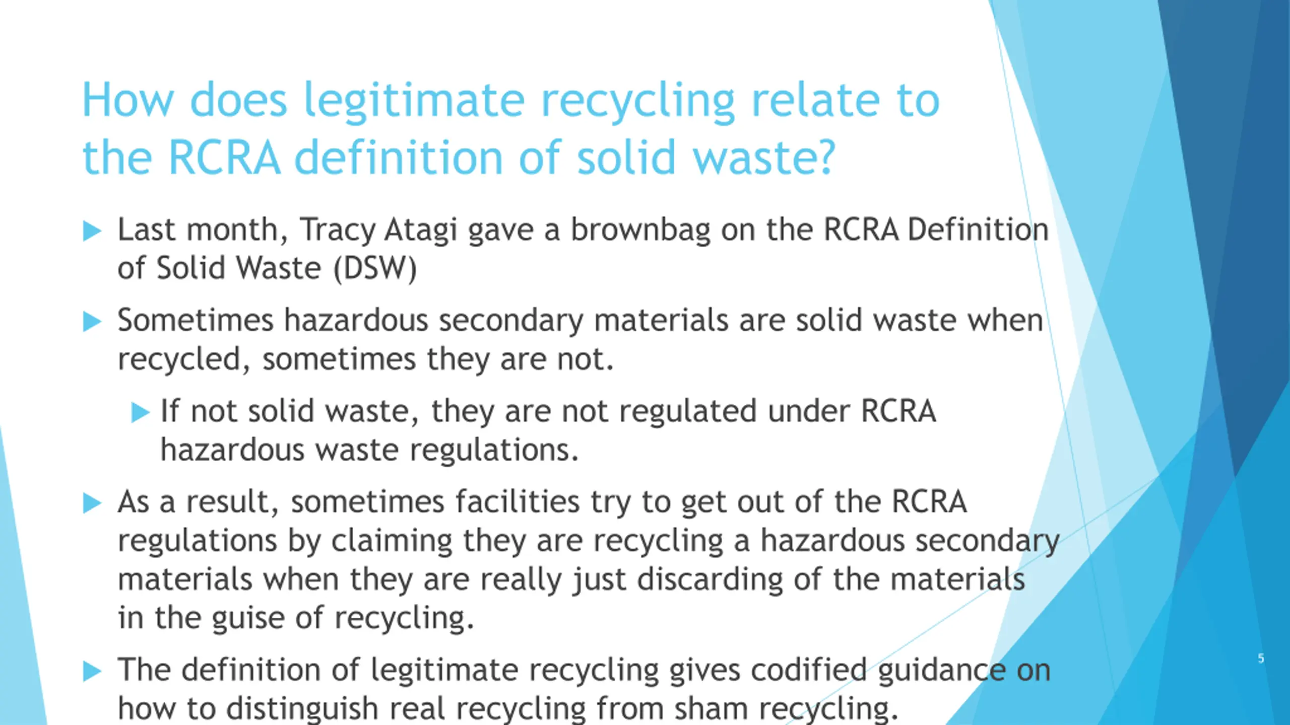 How does legitimate recycling relate to the RCRA definition of solid waste? Last month, Tracy Atagi gave a brownbag on the RCRA Definition of Solid Waste (DSW) Sometimes hazardous secondary materials are solid waste when recycled, sometimes they are not. If not solid waste, they are not regulated under RCRA hazardous waste regulations. As a result, sometimes facilities try to get out of the RCRA regulations by claiming they are recycling a hazardous secondary materials when they are really just discarding of the materials in the guise of recycling. The definition of legitimate recycling gives codified guidance on how to distinguish real recycling from sham recycling. 5
