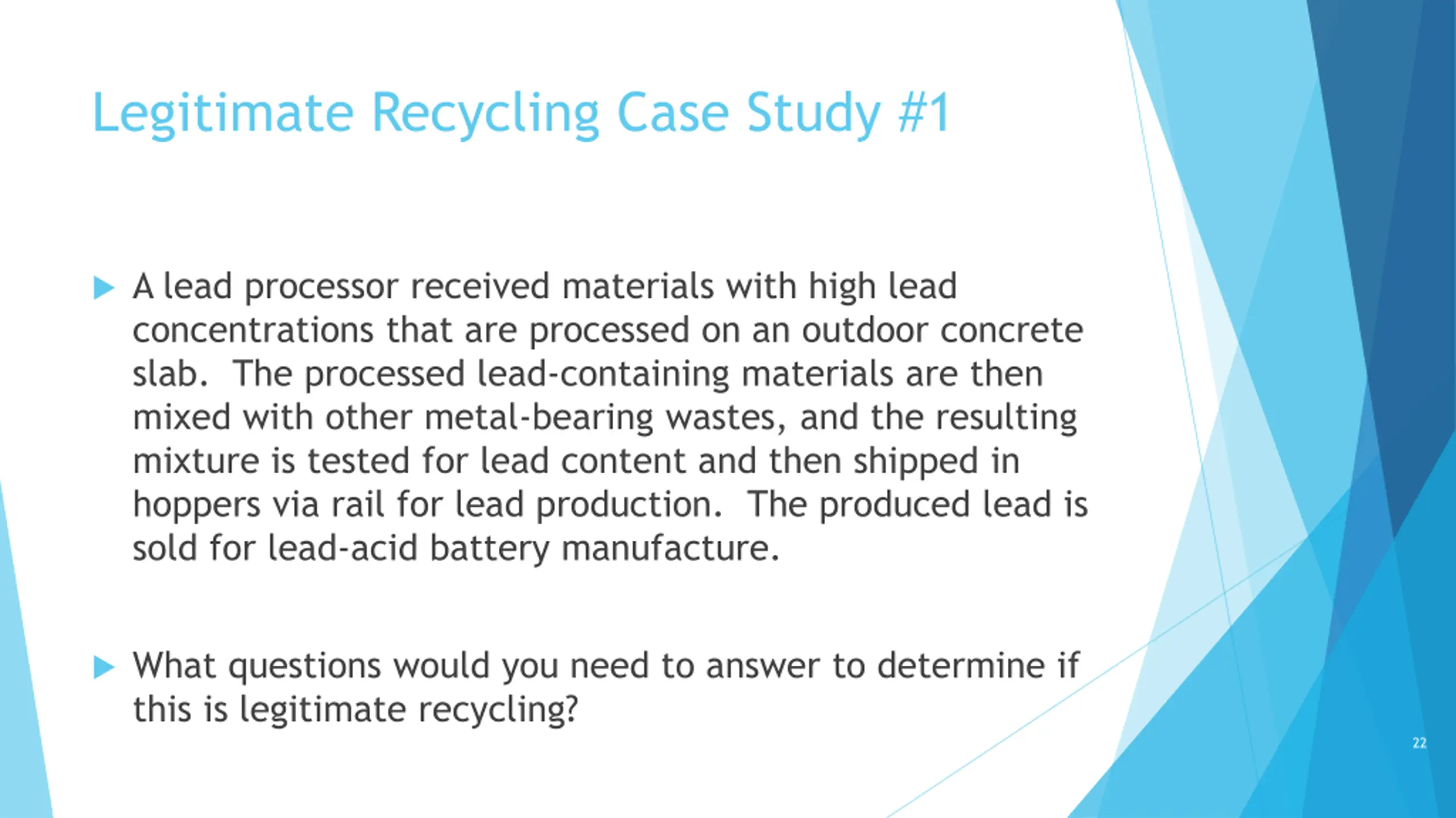 Legitimate Recycling Case Study #1 A lead processor received materials with high lead concentrations that are processed on an outdoor concrete slab. The processed lead-containing materials are then mixed with other metal-bearing wastes, and the resulting mixture is tested for lead content and then shipped in hoppers via rail for lead production. The produced lead is sold for lead-acid battery manufacture. What questions would you need to answer to determine if this is legitimate recycling? 22