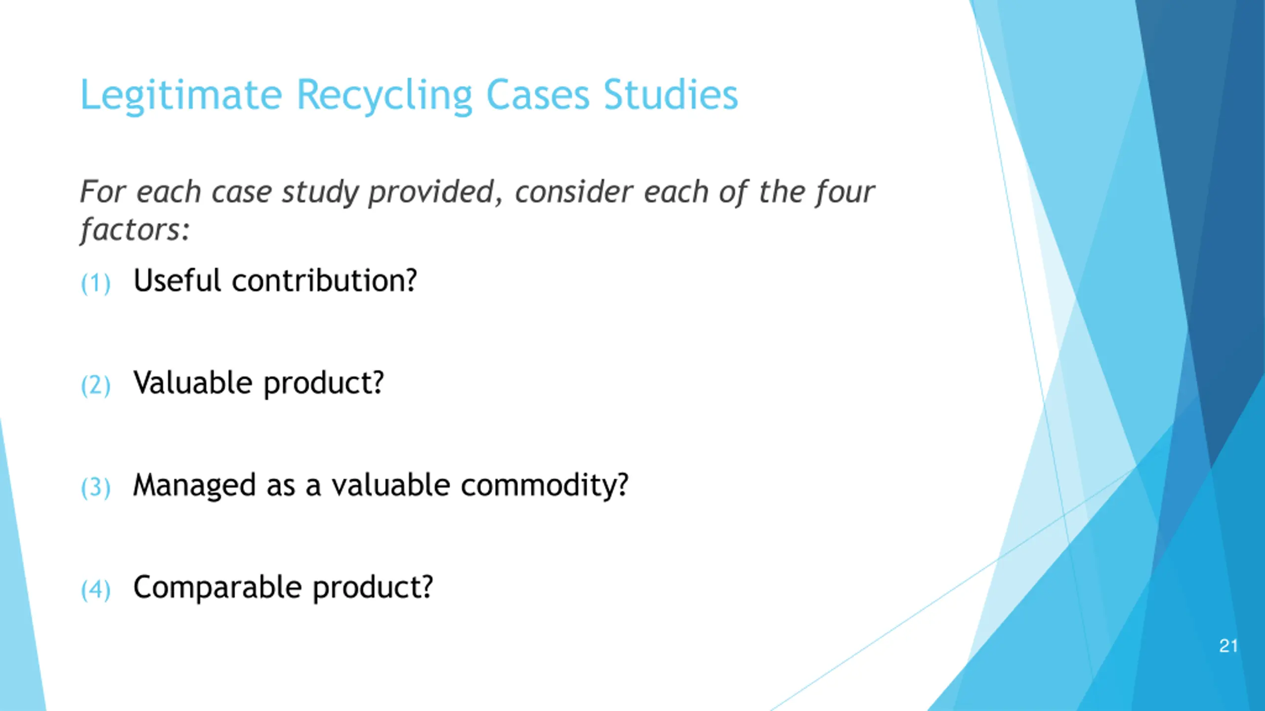 Legitimate Recycling Cases Studies For each case study provided, consider each of the four factors: (1) Useful contribution? (2) Valuable product? (3) Managed as a valuable commodity? (4) Comparable product? 21