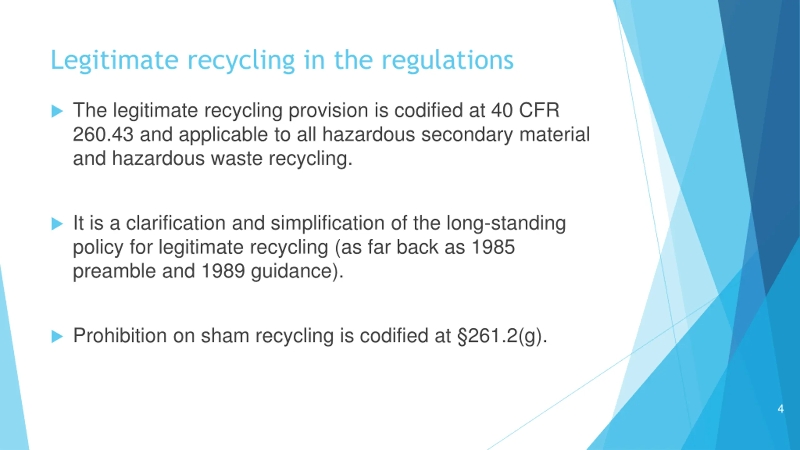 Legitimate recycling in the regulations The legitimate recycling provision is codified at 40 CFR 260.43 and applicable to all hazardous secondary material and hazardous waste recycling. It is a clarification and simplification of the long-standing policy for legitimate recycling (as far back as 1985 preamble and 1989 guidance). Prohibition on sham recycling is codified at 261.2(g). 4