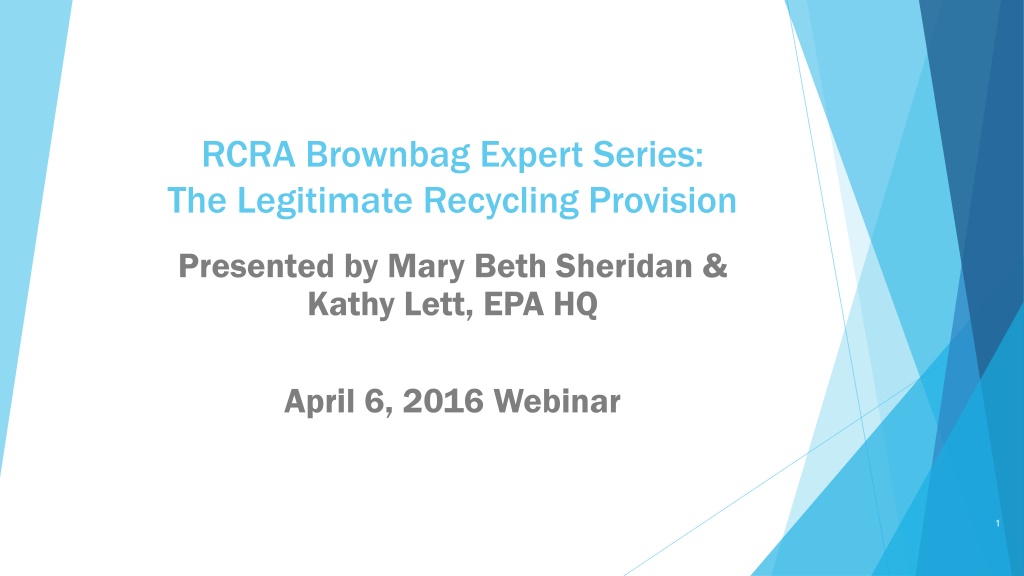 RCRA Brownbag Expert Series: The Legitimate Recycling Provision Presented by Mary Beth Sheridan & Kathy Lett, EPA HQ April 6, 2016 Webinar 1