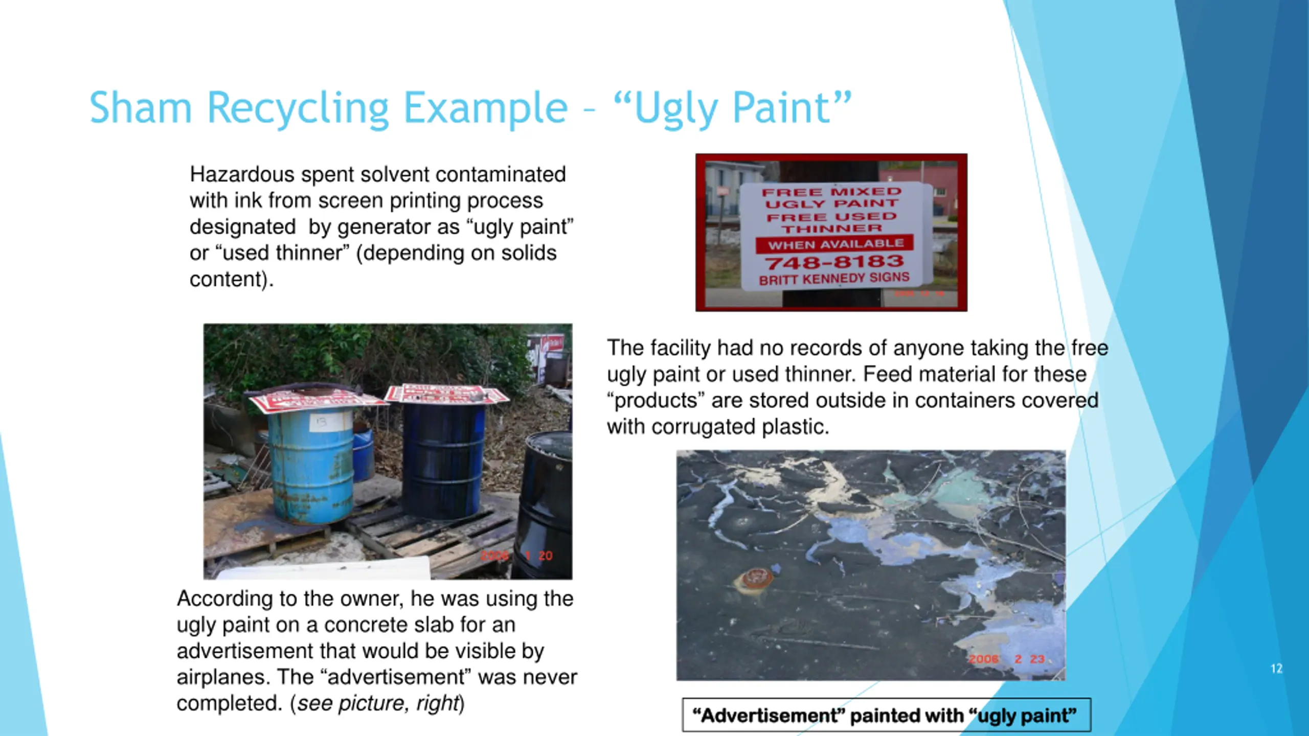 Sham Recycling Example Ugly Paint Hazardous spent solvent contaminated with ink from screen printing process designated by generator as ugly paint or used thinner (depending on solids content). The facility had no records of anyone taking the free ugly paint or used thinner. Feed material for these products are stored outside in containers covered with corrugated plastic. According to the owner, he was using the ugly paint on a concrete slab for an advertisement that would be visible by airplanes. The advertisement was never completed. (see picture, right) 12 Advertisement painted with ugly paint Advertisement painted with ugly paint