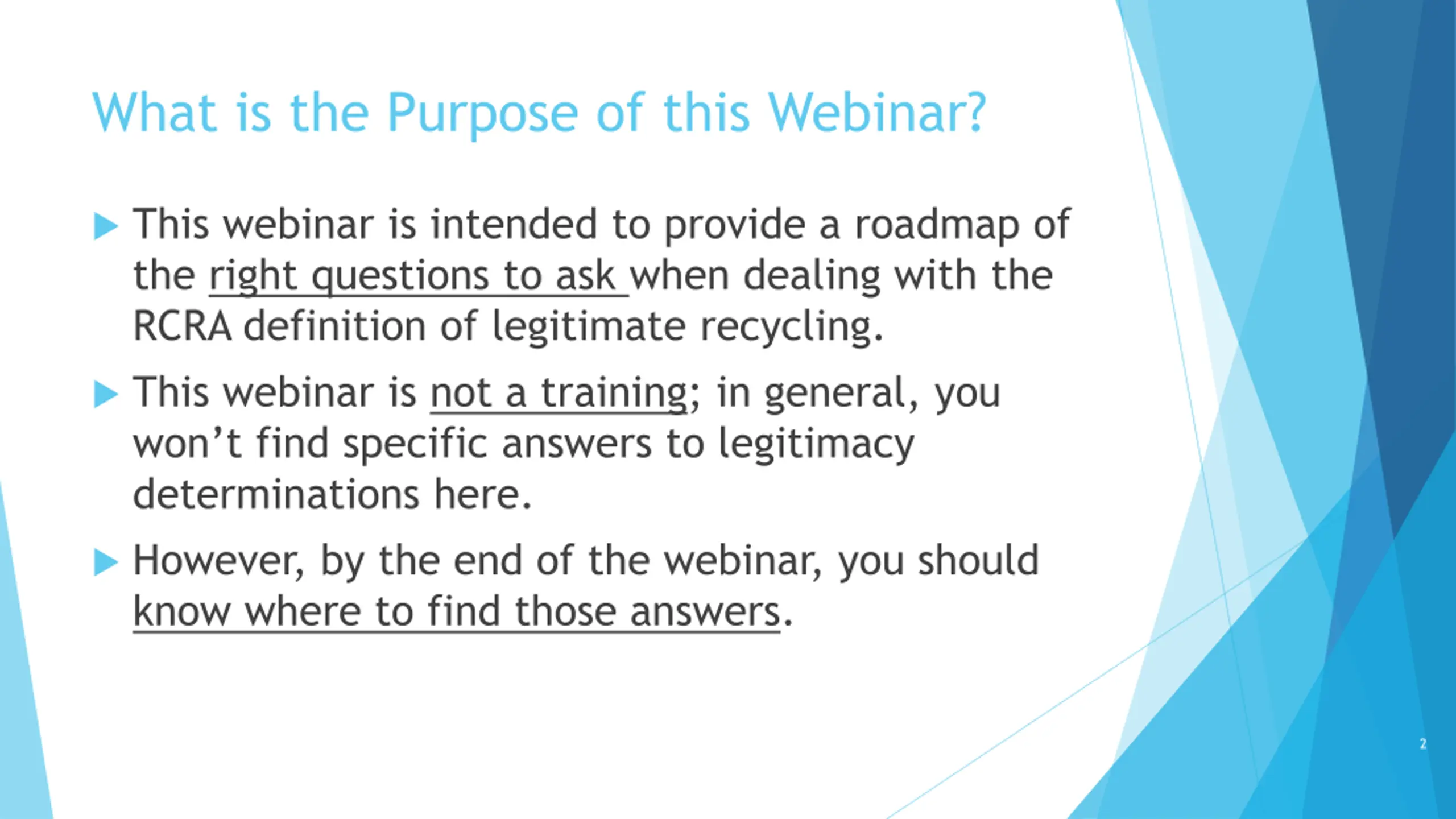 What is the Purpose of this Webinar? This webinar is intended to provide a roadmap of the right questions to ask when dealing with the RCRA definition of legitimate recycling. This webinar is not a training; in general, you won t find specific answers to legitimacy determinations here. However, by the end of the webinar, you should know where to find those answers. 2