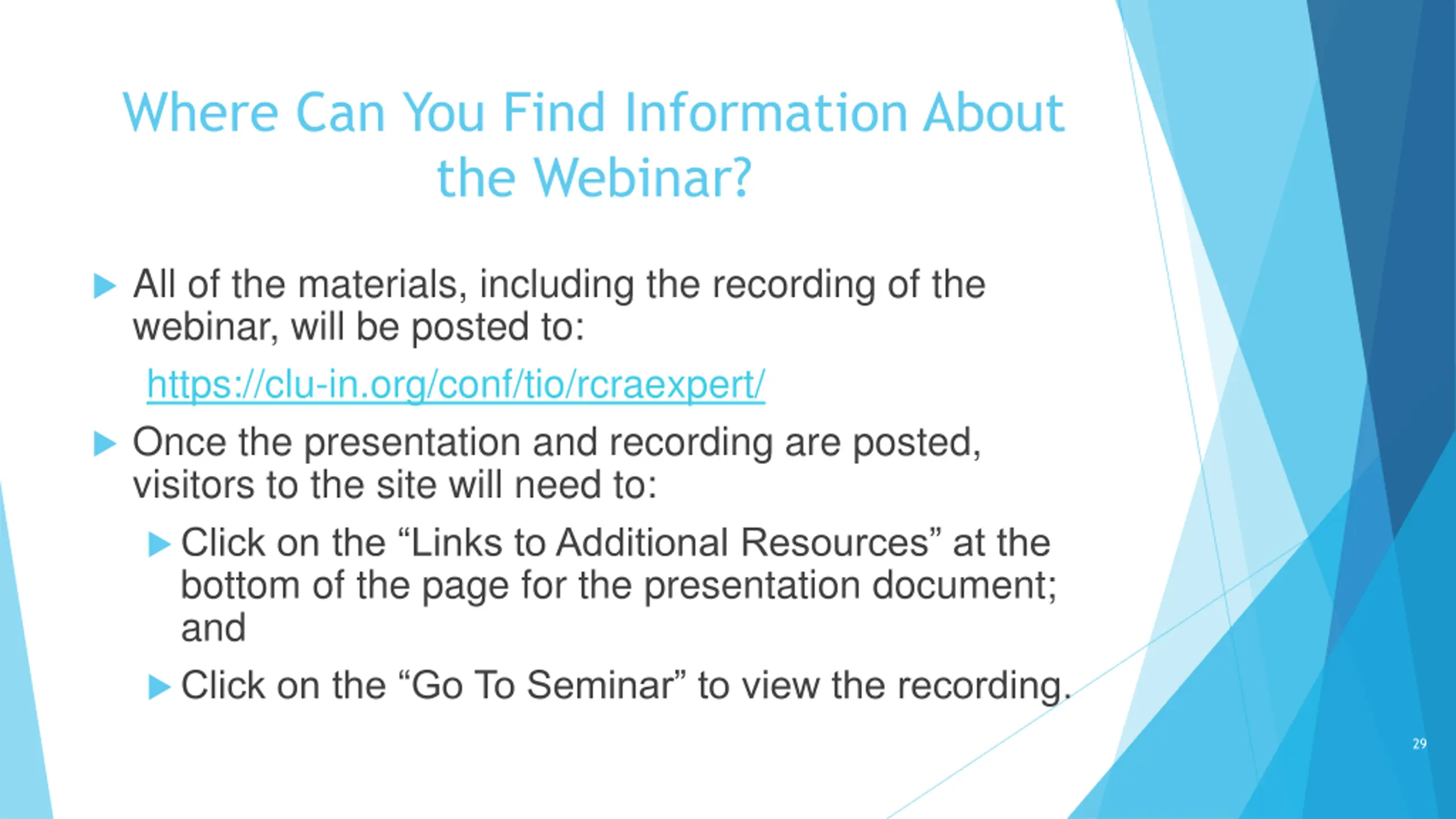 Where Can You Find Information About the Webinar? All of the materials, including the recording of the webinar, will be posted to: https://clu-in.org/conf/tio/rcraexpert/ Once the presentation and recording are posted, visitors to the site will need to: Click on the Links to Additional Resources at the bottom of the page for the presentation document; and Click on the Go To Seminar to view the recording. 29