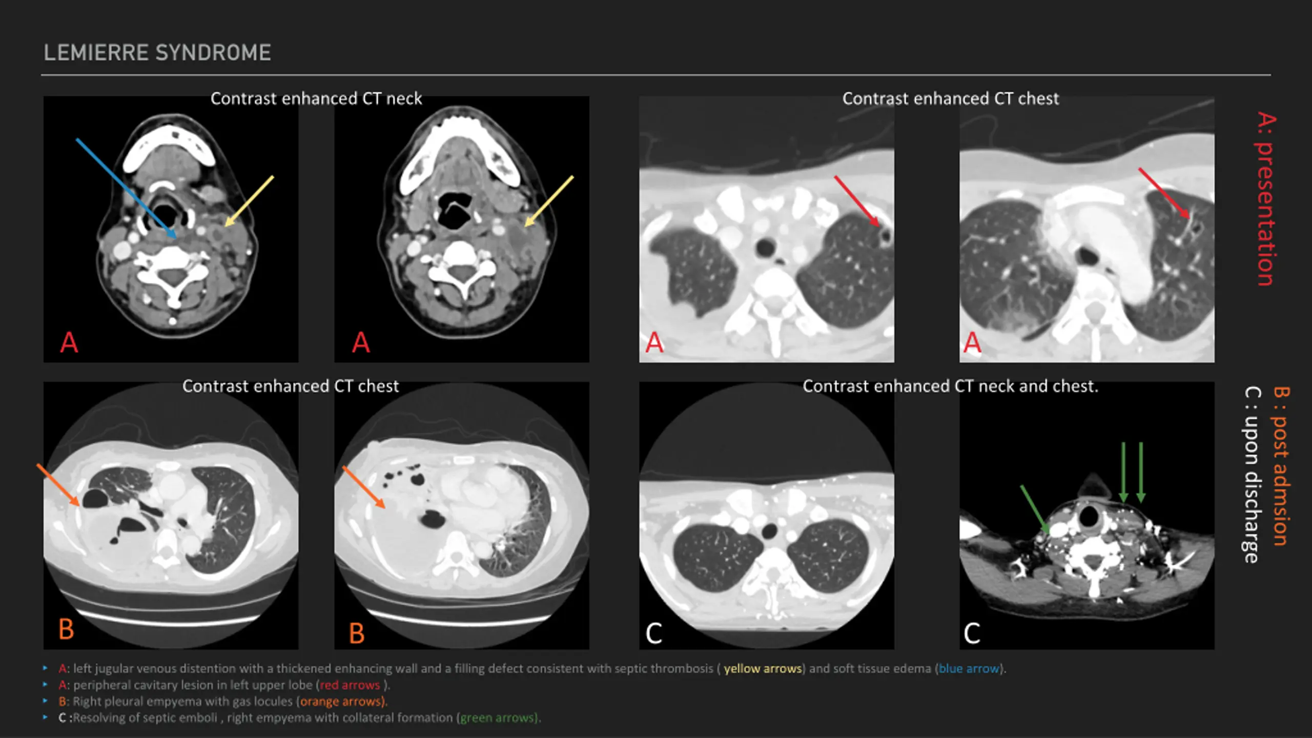 LEMIERRE SYNDROME Contrast enhanced CT neck Contrast enhanced CT chest A: presentation A A A A Contrast enhanced CT chest Contrast enhanced CT neck and chest. C : upon discharge B : post admsion B B C C A: left jugular venous distention with a thickened enhancing wall and a filling defect consistent with septic thrombosis ( yellow arrows) and soft tissue edema (blue arrow). A: peripheral cavitary lesion in left upper lobe (red arrows ). B: Right pleural empyema with gas locules (orange arrows). C :Resolving of septic emboli , right empyema with collateral formation (green arrows).