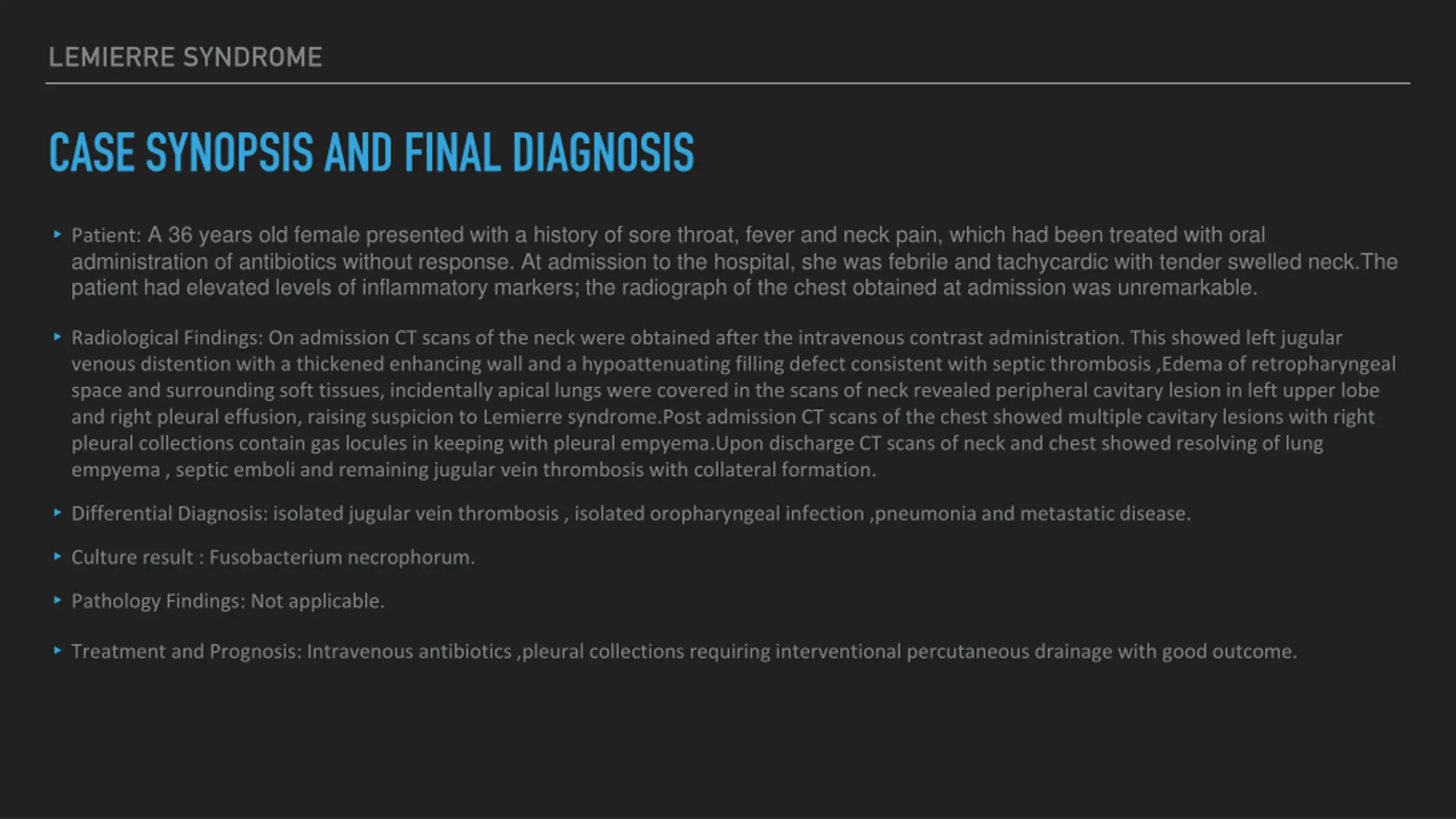 Learn about a case of Lemierre syndrome in a 36-year-old female presenting with sore throat, fever, and neck pain, including radiological findings, differential diagnosis, treatment, and prognosis.