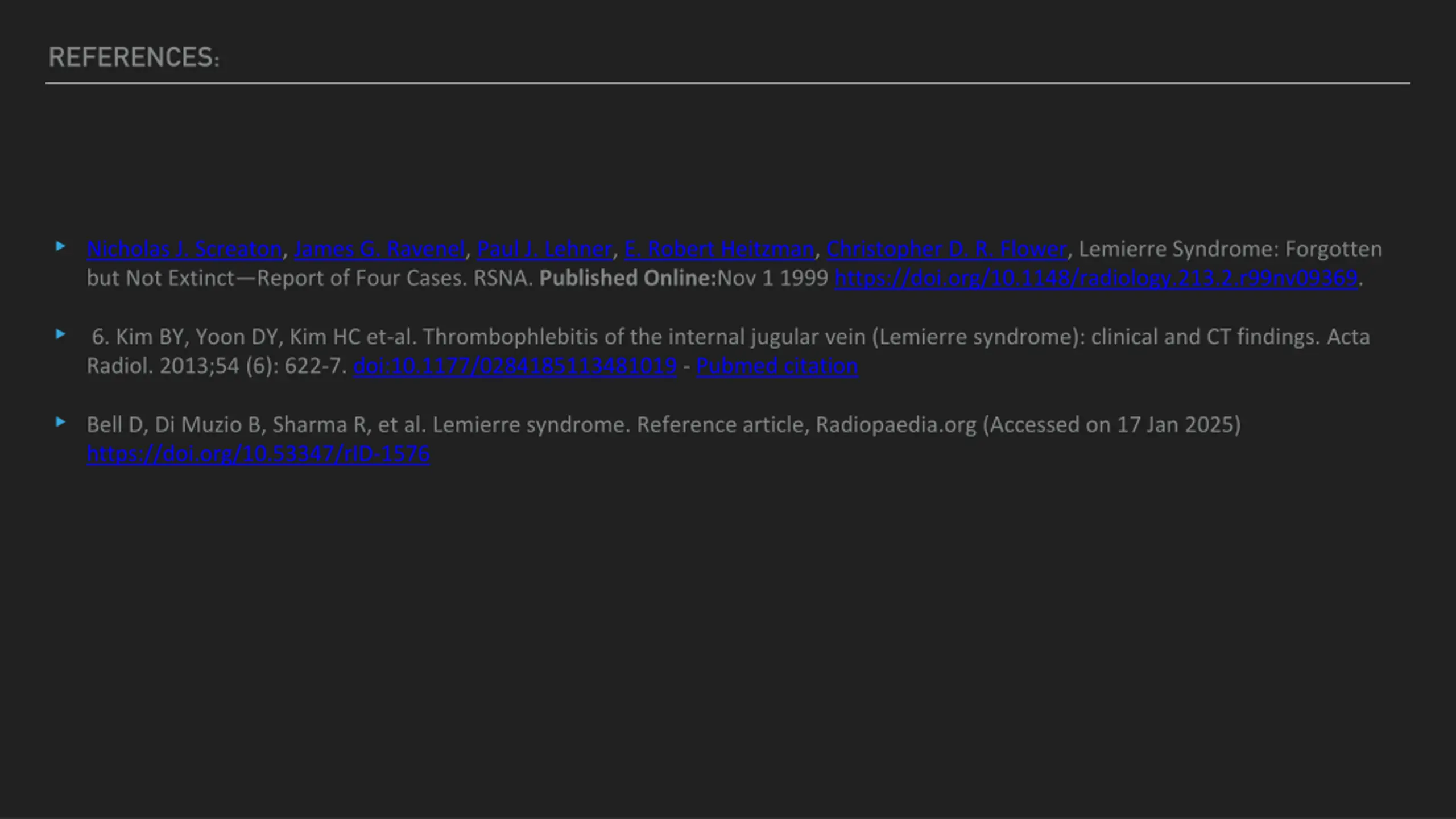 REFERENCES: Nicholas J. Screaton, James G. Ravenel, Paul J. Lehner, E. Robert Heitzman, Christopher D. R. Flower, Lemierre Syndrome: Forgotten but Not Extinct Report of Four Cases. RSNA. Published Online:Nov 1 1999 https://doi.org/10.1148/radiology.213.2.r99nv09369. 6. Kim BY, Yoon DY, Kim HC et-al. Thrombophlebitis of the internal jugular vein (Lemierre syndrome): clinical and CT findings. Acta Radiol. 2013;54 (6): 622-7. doi:10.1177/0284185113481019 - Pubmed citation Bell D, Di Muzio B, Sharma R, et al. Lemierre syndrome. Reference article, Radiopaedia.org (Accessed on 17 Jan 2025) https://doi.org/10.53347/rID-1576