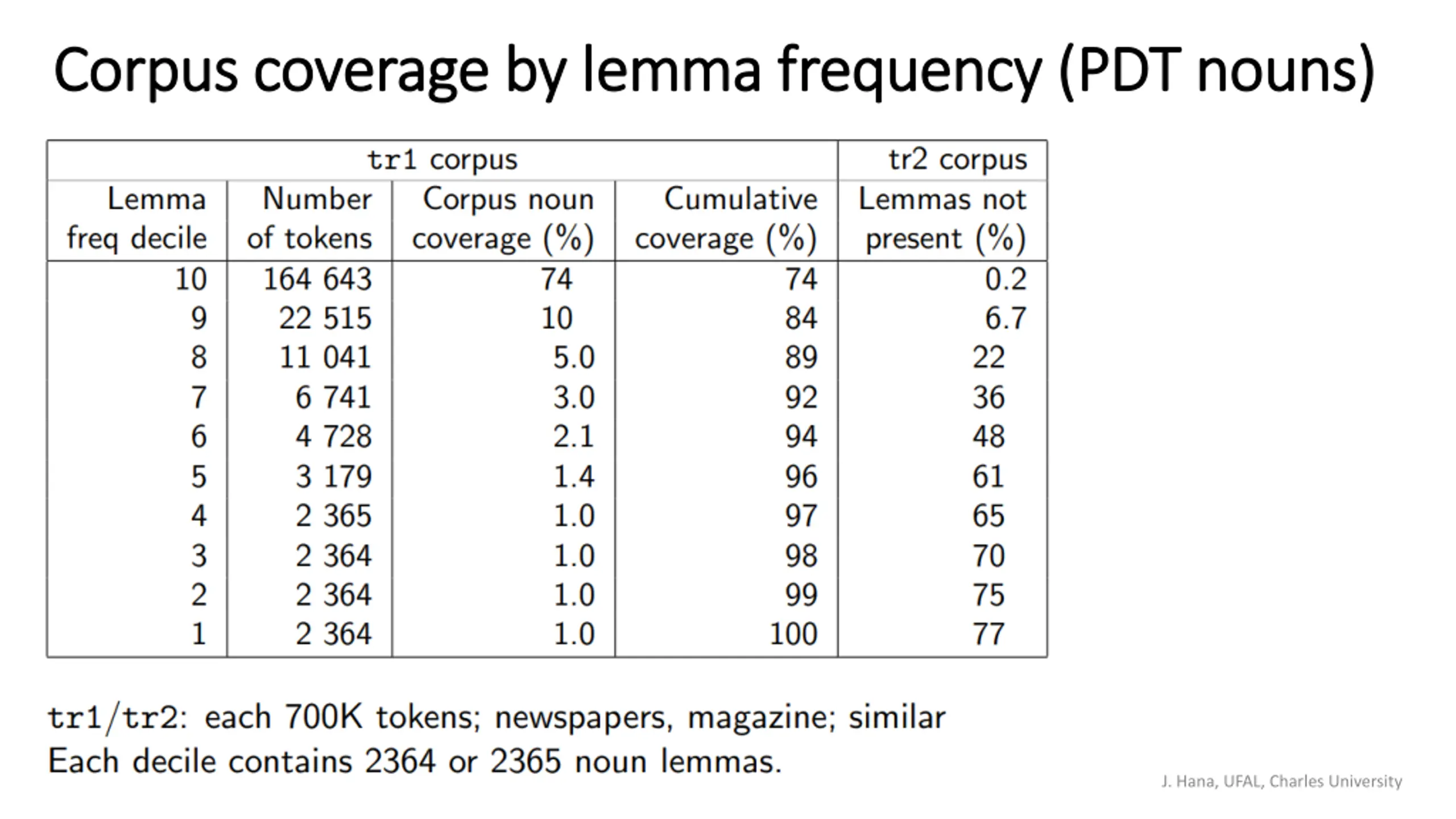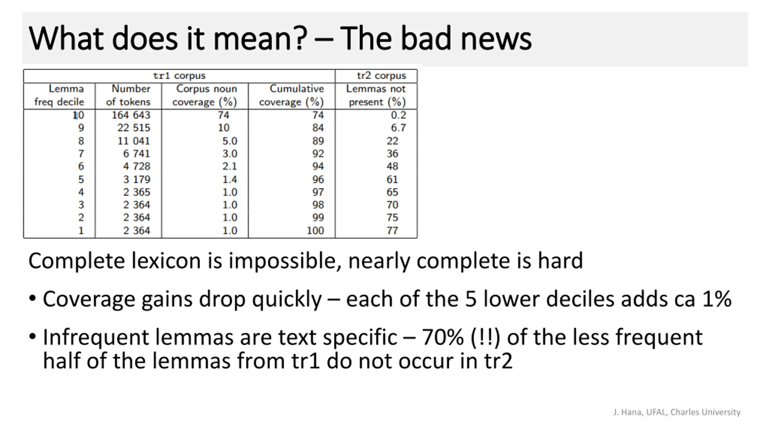 What does it mean? What does it mean? The bad news The bad news Complete lexicon is impossible, nearly complete is hard Coverage gains drop quickly each of the 5 lower deciles adds ca 1% Infrequent lemmas are text specific 70% (!!) of the less frequent half of the lemmas from tr1 do not occur in tr2 J. Hana, UFAL, Charles University
