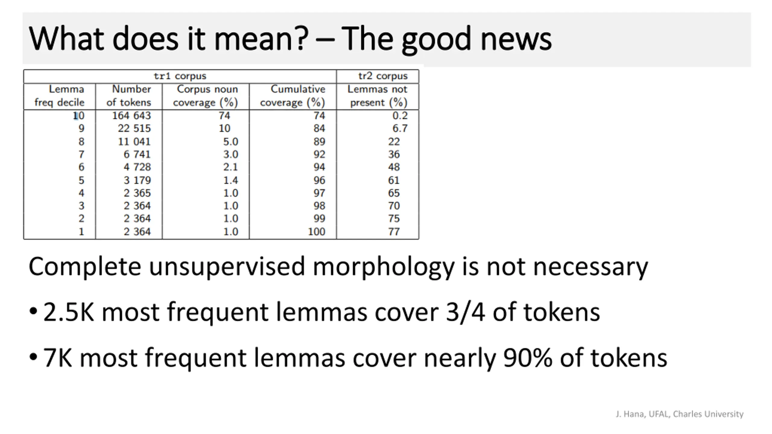 What does it mean? What does it mean? The good news The good news Complete unsupervised morphology is not necessary 2.5K most frequent lemmas cover 3/4 of tokens 7K most frequent lemmas cover nearly 90% of tokens J. Hana, UFAL, Charles University