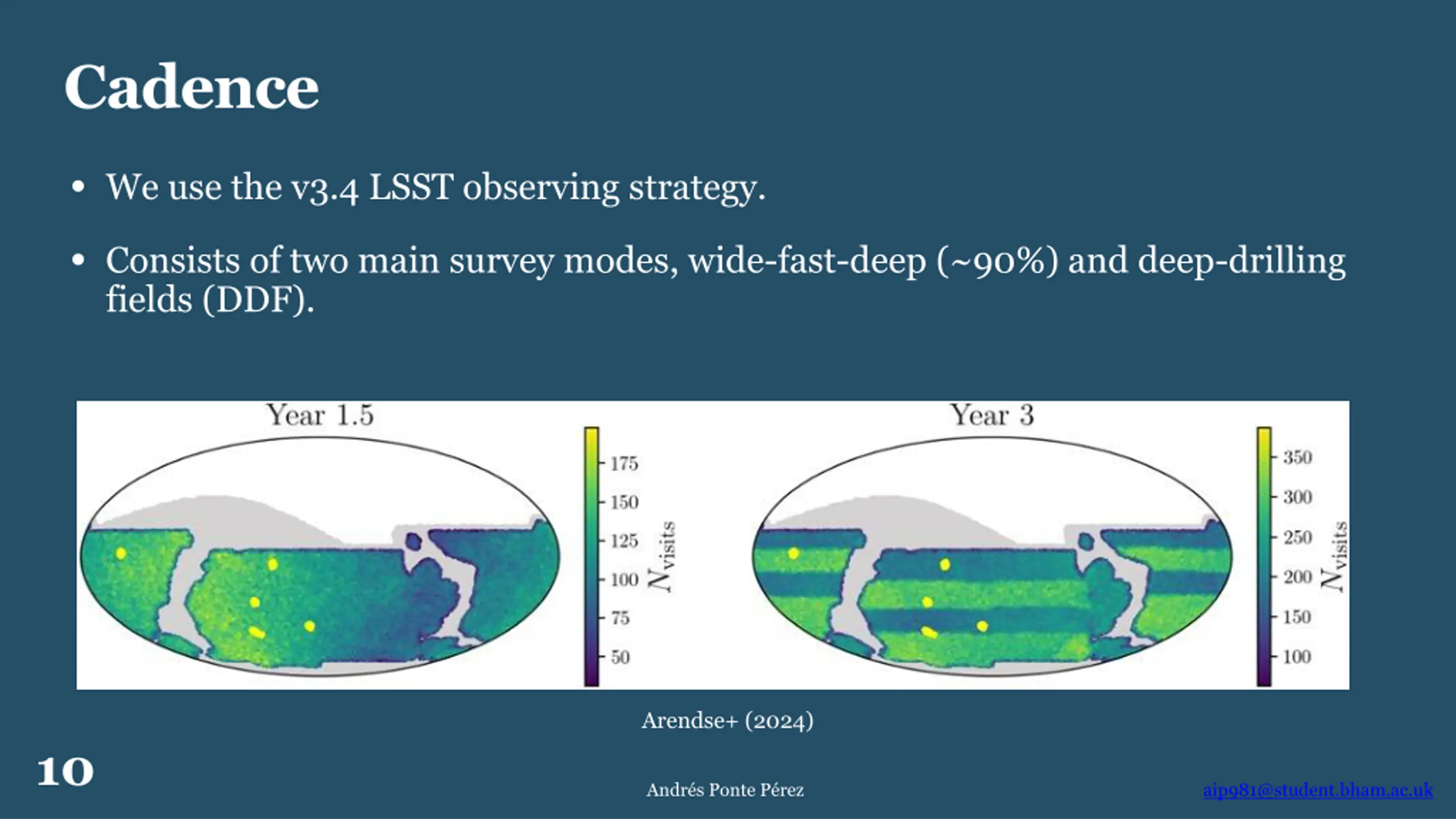 Cadence We use the v3.4 LSST observing strategy. Consists of two main survey modes, wide-fast-deep (~90%) and deep-drilling fields (DDF). Arendse+ (2024) 10 Andr s Ponte P rez aip981@student.bham.ac.uk