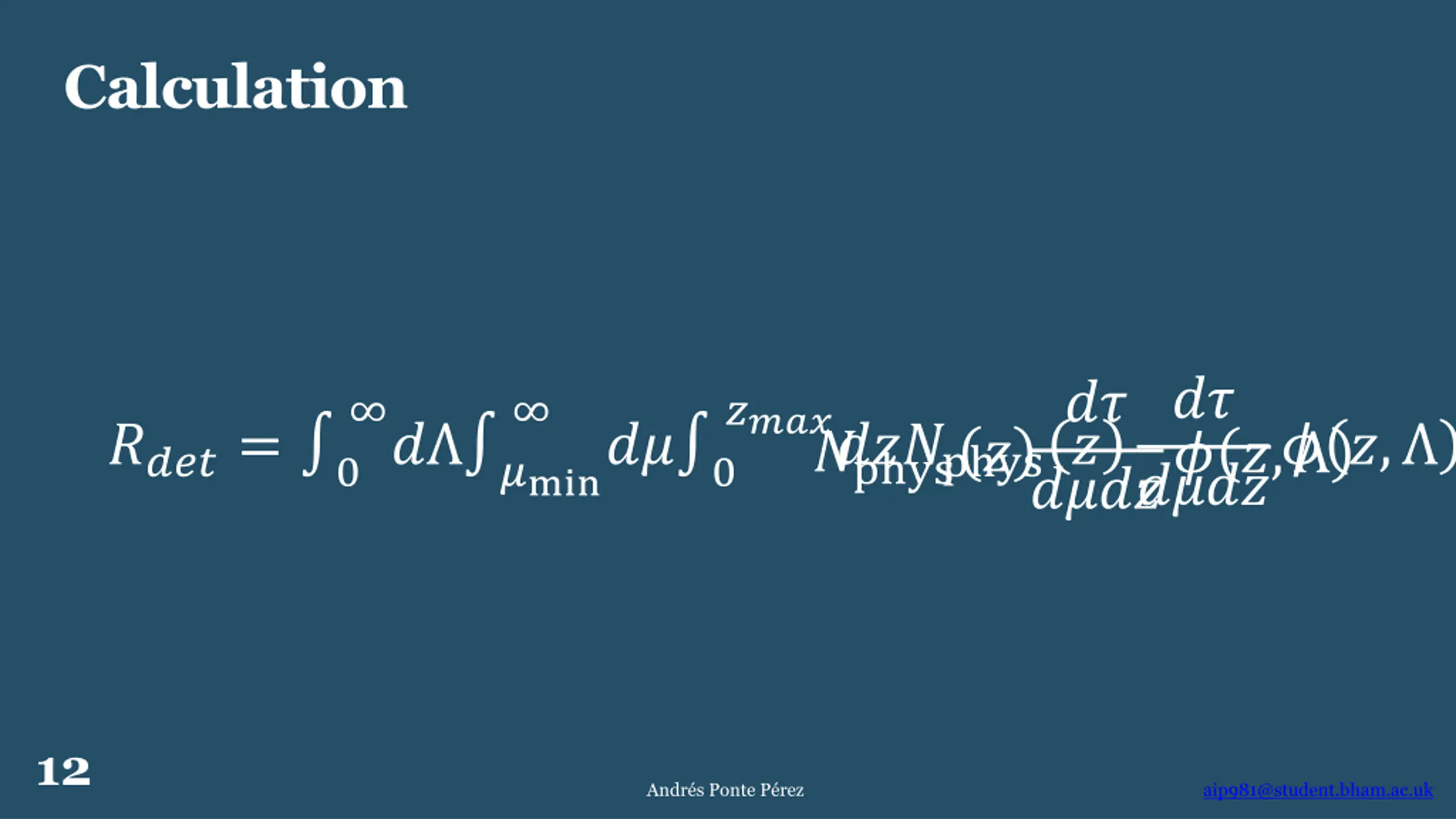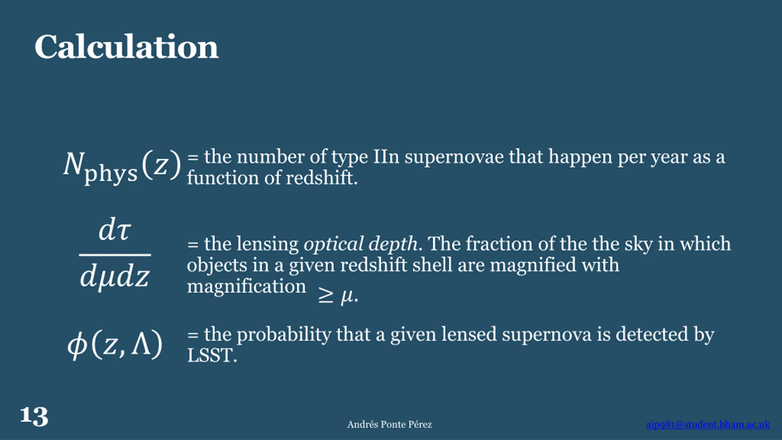 Calculation = the number of type IIn supernovae that happen per year as a function of redshift. ?phys? ?? = the lensing optical depth. The fraction of the the sky in which objects in a given redshift shell are magnified with magnification ?. ???? = the probability that a given lensed supernova is detected by LSST. ? ?, 13 Andr s Ponte P rez aip981@student.bham.ac.uk